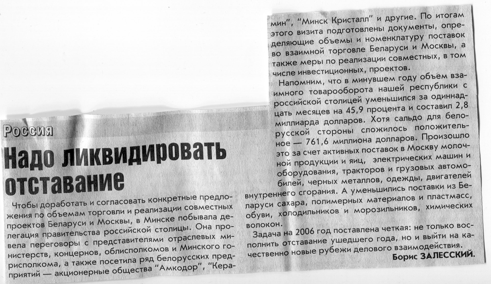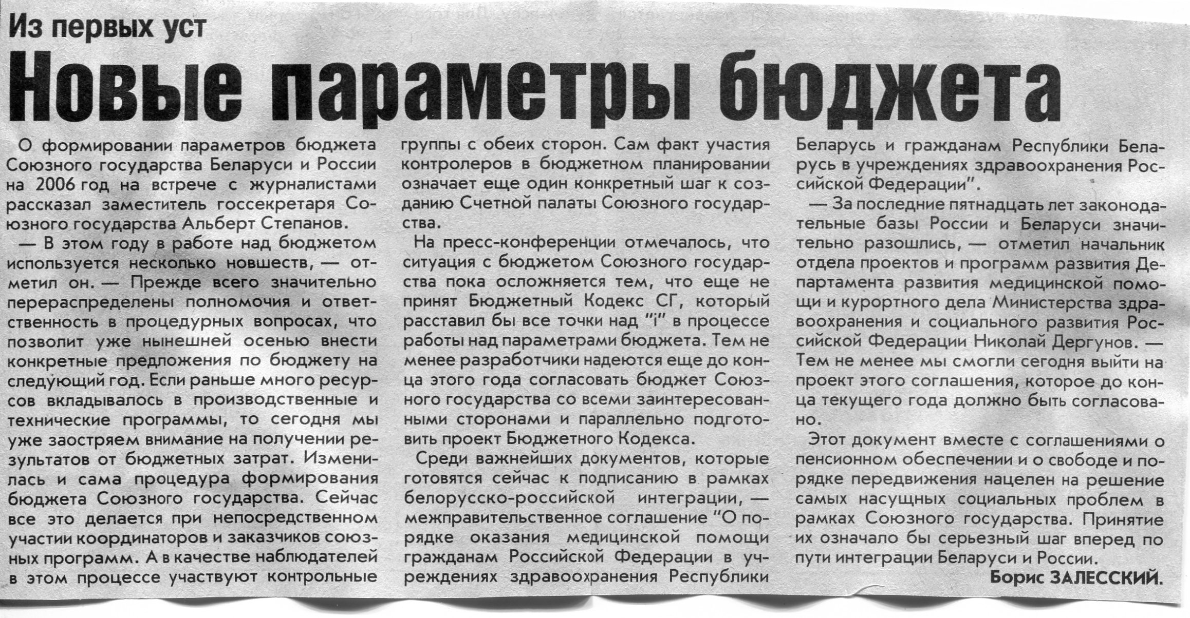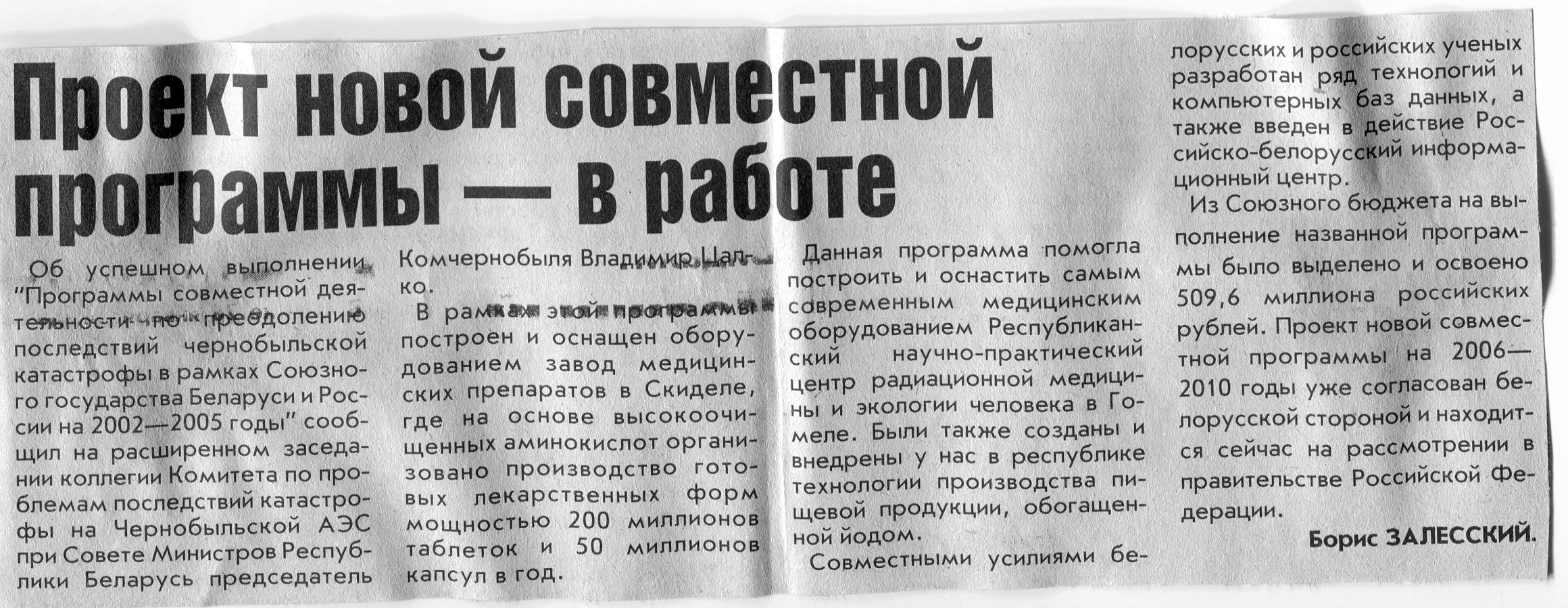 Залесский, Б. Проект новой совместной программы - в работе / Б. Залесский // Вечерний Минск. - 2006. - 26 янв.
