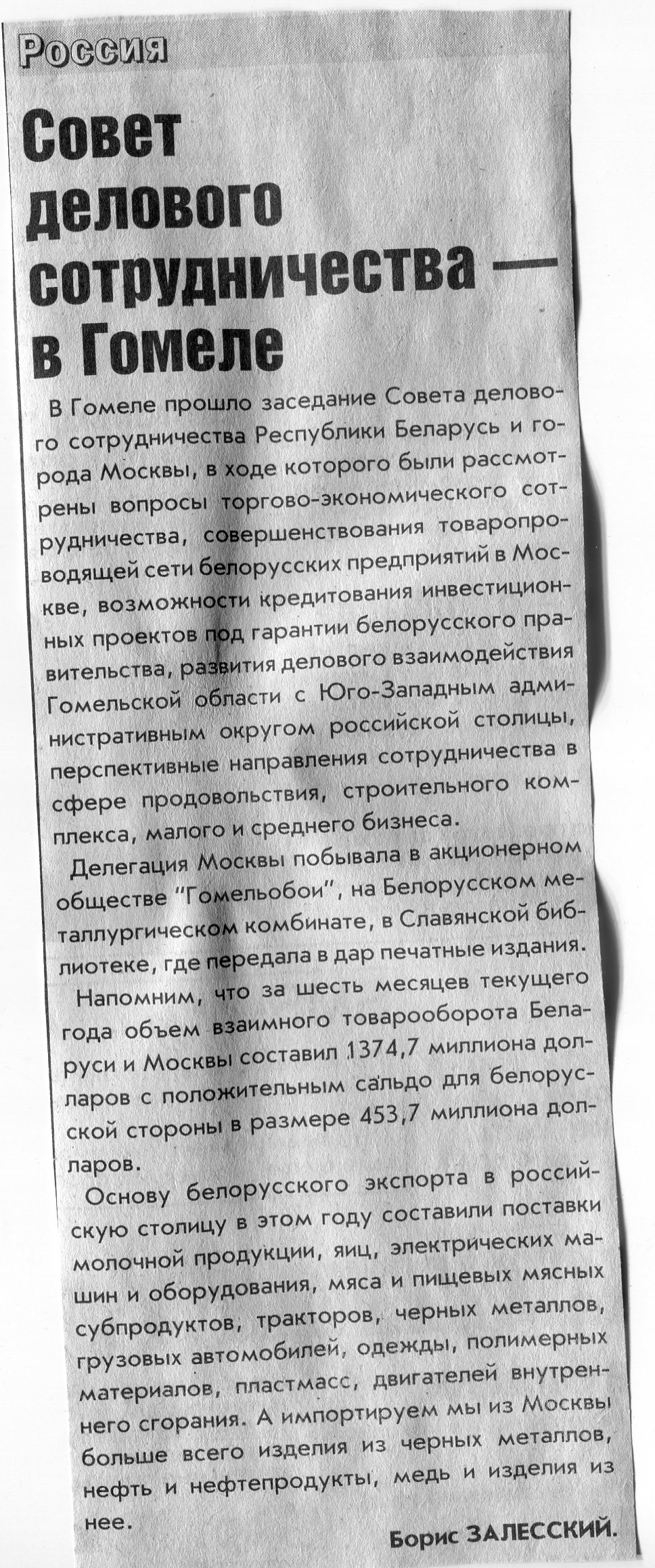 Залесский, Б. Совет делового сотрудничества - в Гомеле / Б. Залесский // Вечерний Минск. - 2005. - 8 сент.