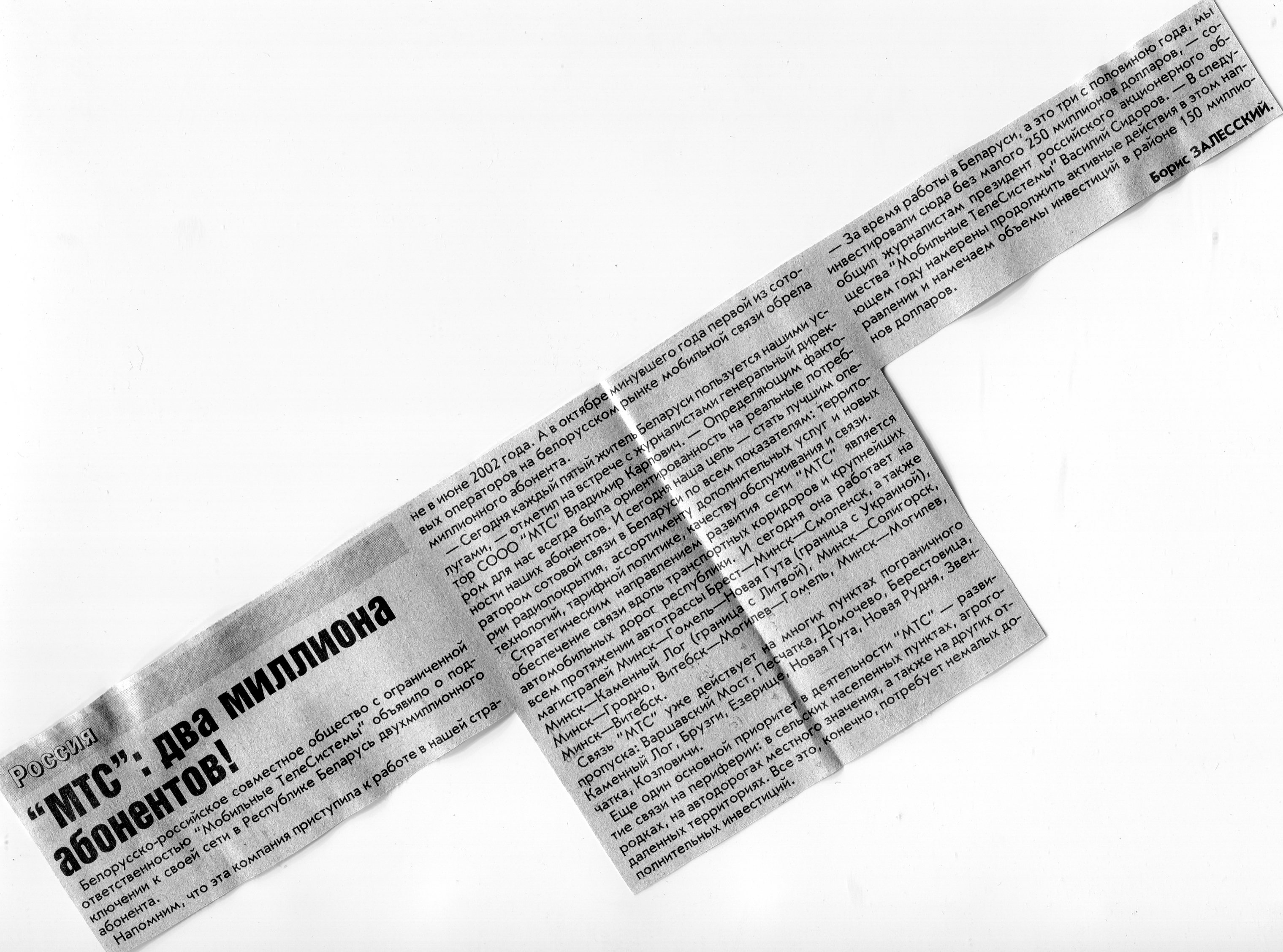 Залесский, Б. "МТС": два миллиона абонентов! / Б. Залесский // Вечерний Минск. - 2005. - 9 дек.