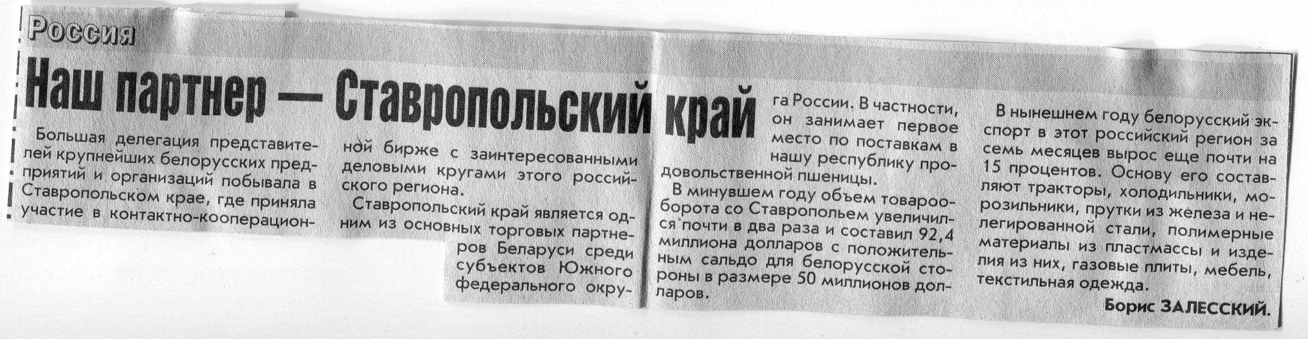 Залесский, Б. Наш партнер - Ставропольский край / Б. Залесский // Вечерний Минск. - 2005. - 6 окт.