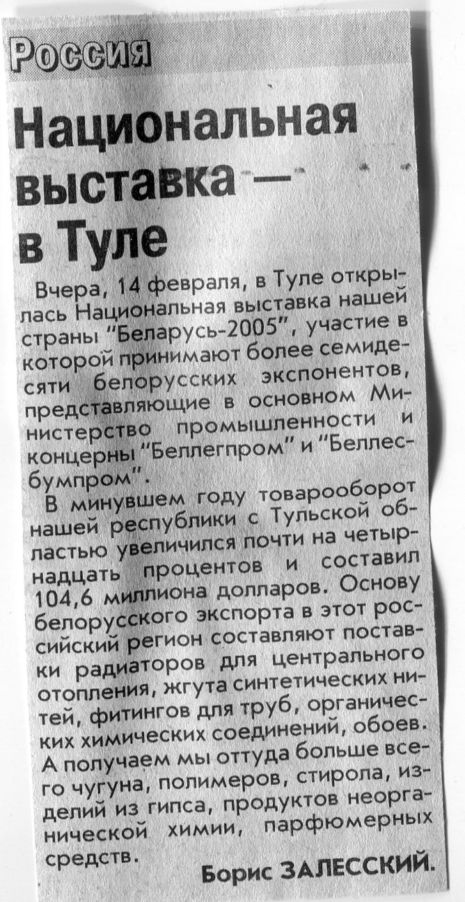 Залесский, Б. Национальная выставка - в Туле / Б. Залесский // Вечерний Минск. - 2005. - 15 февр.
