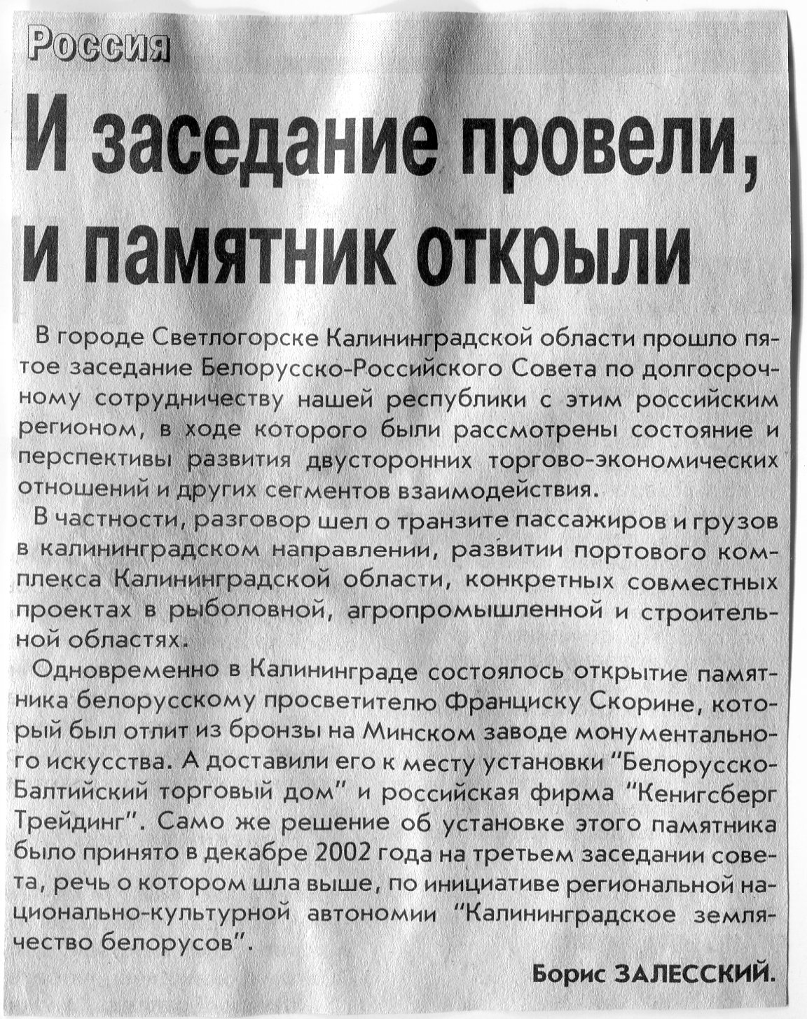 Залесский, Б. И заседание провели, и памятник открыли / Б. Залесский // Вечерний Минск. - 2005. - 27 янв.