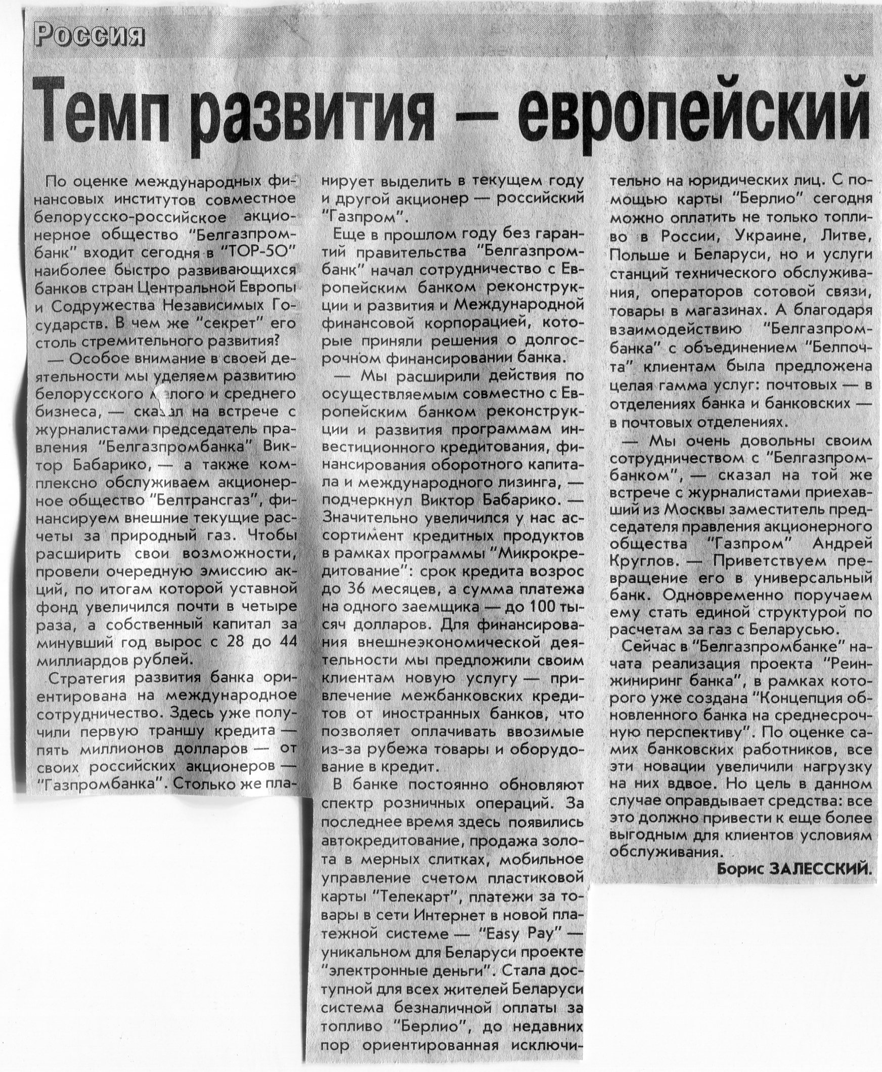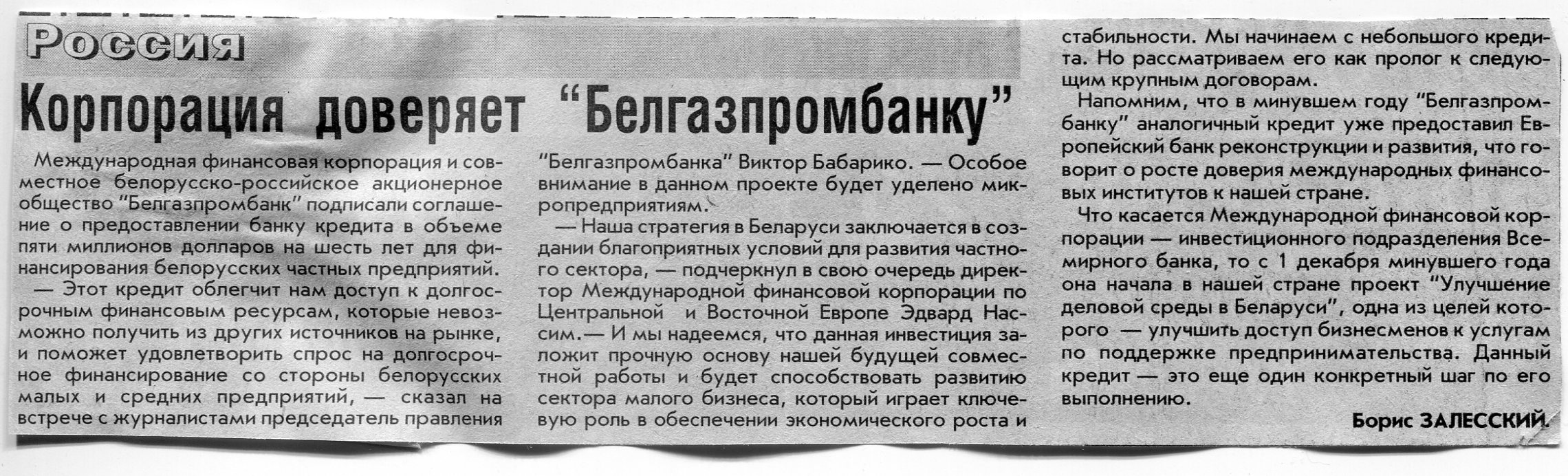 Залесский, Б. Корпорация доверяет "Белгазпромбанку" / Б. Залесский // Вечерний Минск. - 2005. - 1июл.