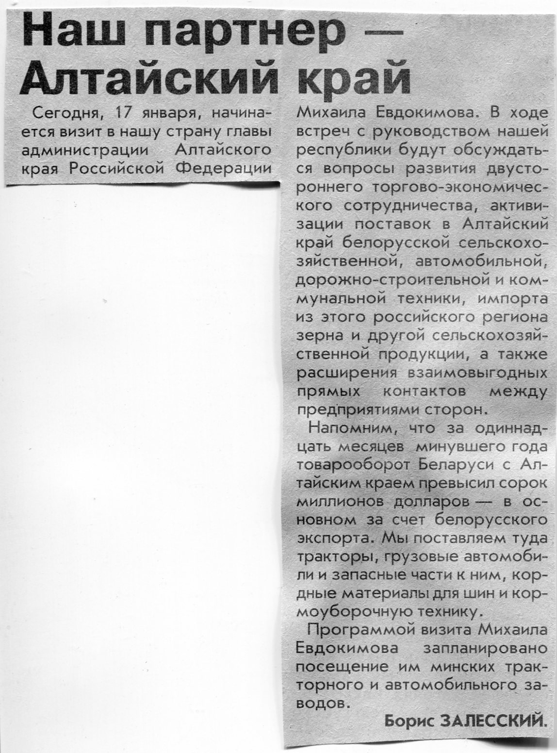 Залесский, Б. Наш партнер - Алтайский край / Б. Залесский // Вечерний Минск. - 2005. - 17 янв.