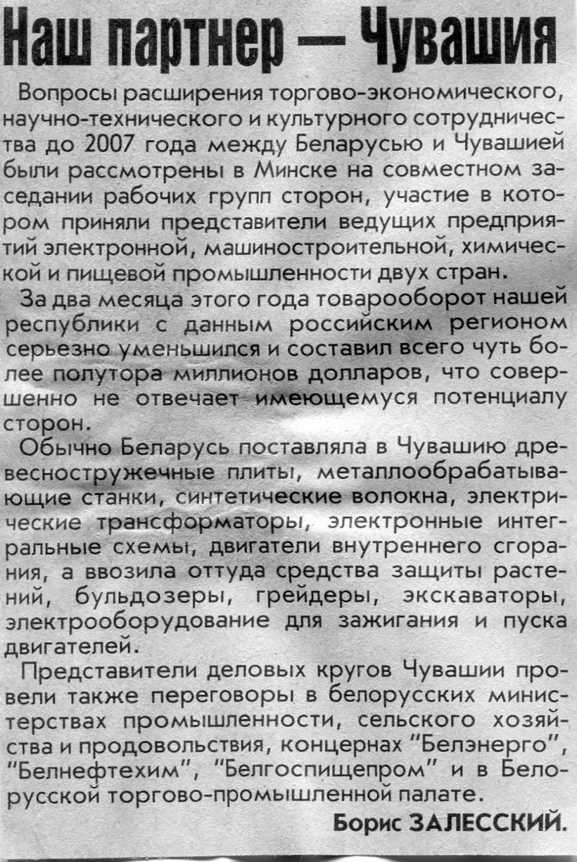 Залесский, Б. Наш партнер - Чувашия / Б. Залесский // Вечерний Минск. - 2005. - 25 апр.