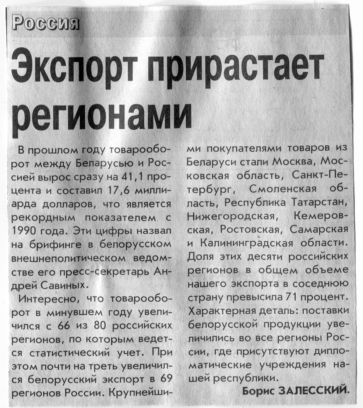Залесский, Б. Экспорт прирастает регионами / Б. Залесский // Вечерний Минск. - 2005. - 7 февр.