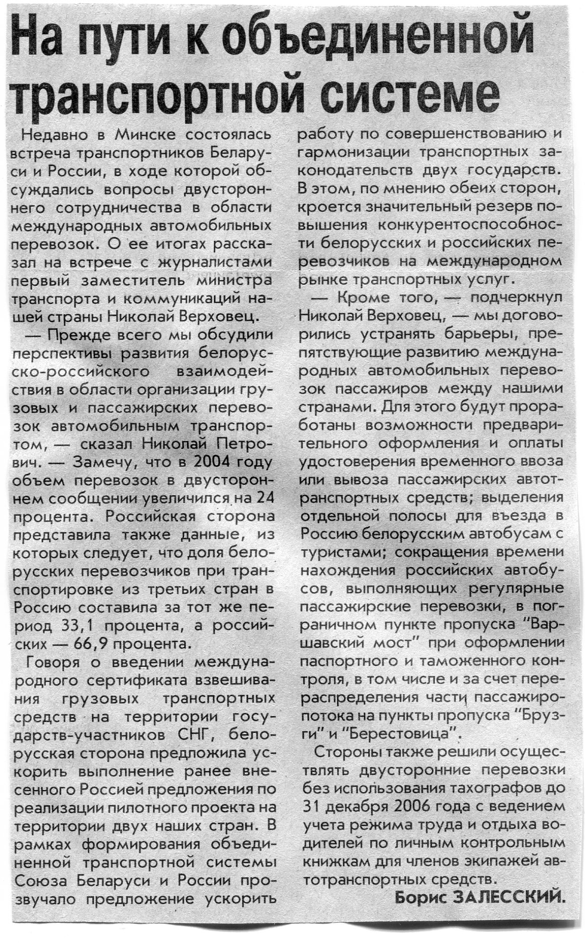 Залесский, Б. На пути к объединенной транспортной системе / Б. Залесский // Вечерний Минск. - 2005. - 6 янв.