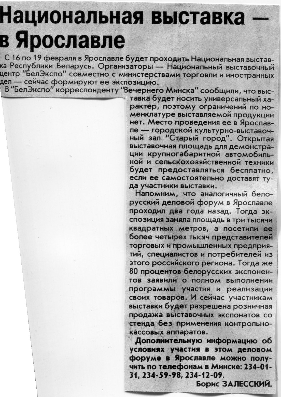 Залесский, Б. Национальная выставка - в Ярославле / Б. Залесский // Вечерний Минск. - 2005. - 10 янв.