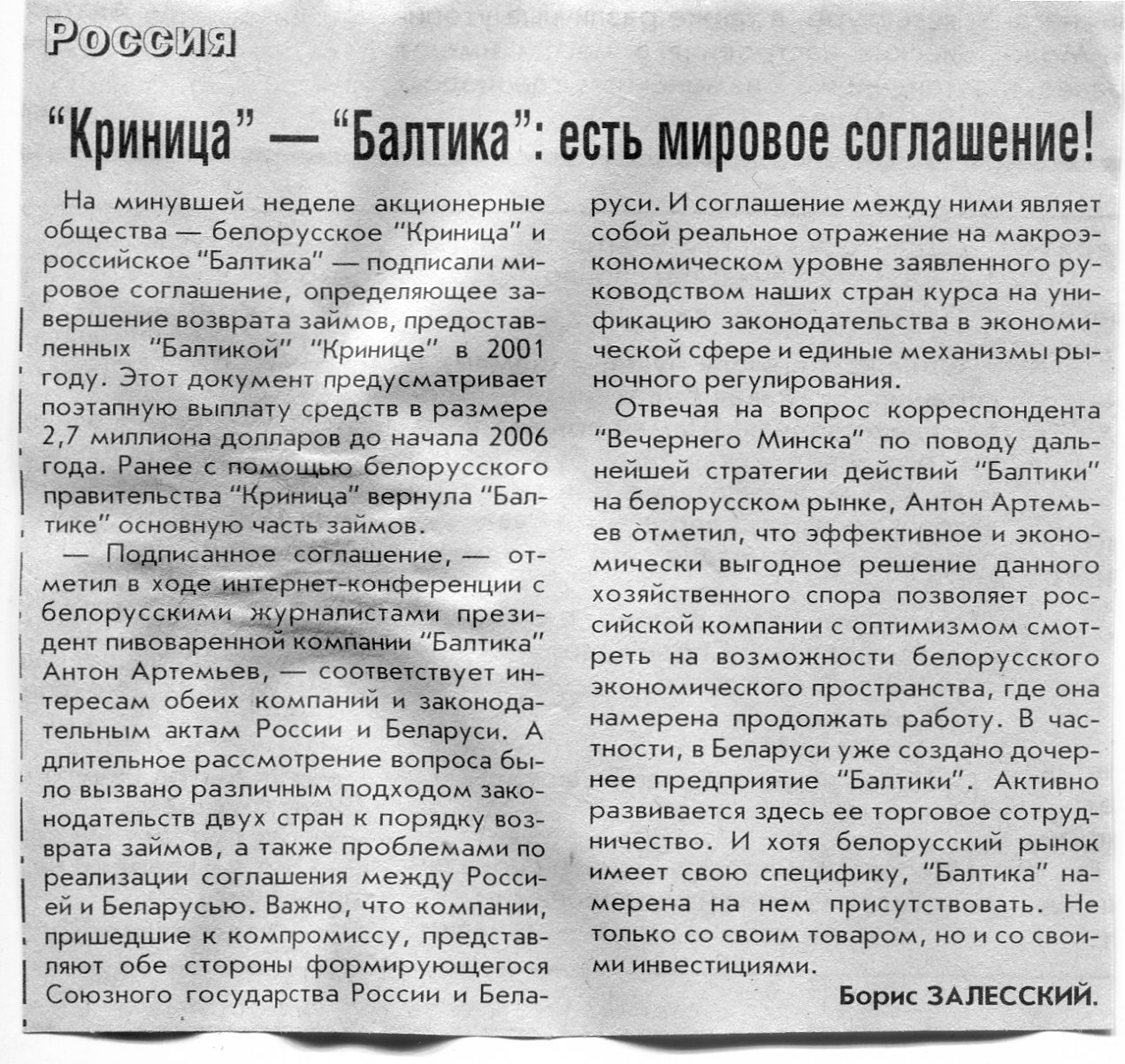 Залесский, Б. "Криница" - "Балтика": есть мировое соглашение! / Б. Залесский // Вечерний Минск. - 2005. - 7 июл.
