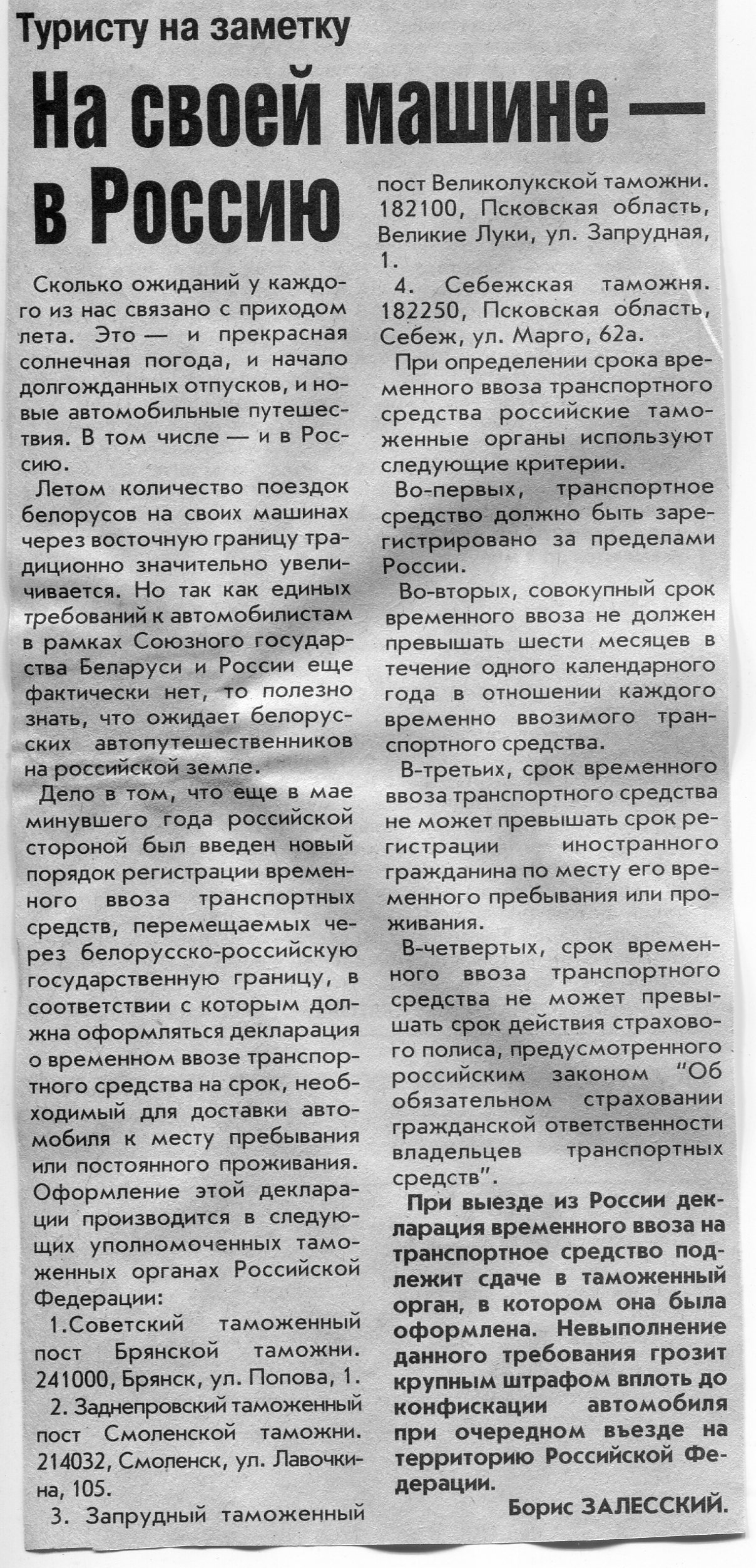 Залесский, Б. На своей машине - в Россию / Б. Залесский // Вечерний Минск. - 2005. - 1 июн.