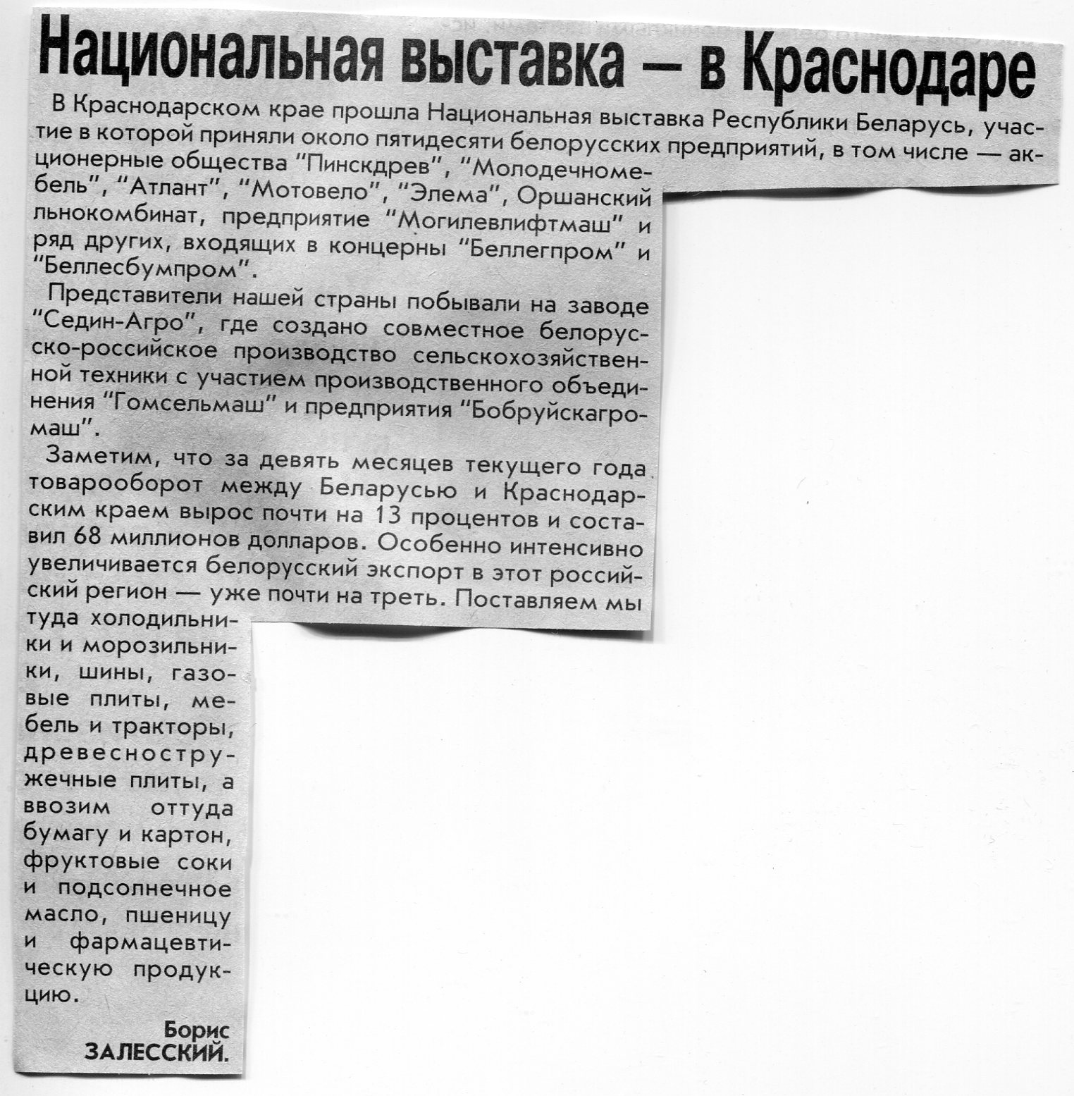 Залесский, Б. Национальная выставка - в Краснодаре / Б. Залесский // Вечерний Минск. - 2004. - 7 дек.