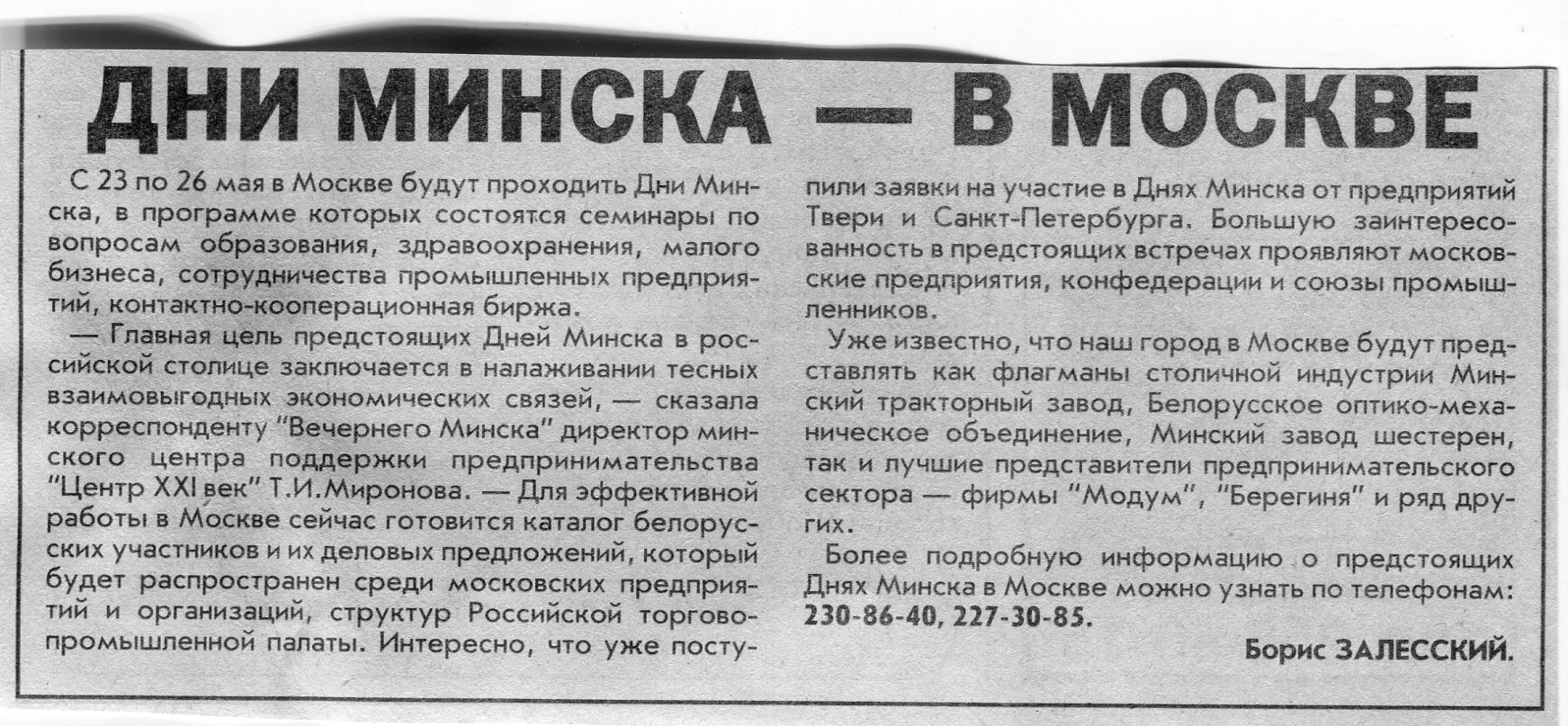 Залесский, Б. Дни Минска - в Москве / Б. Залесский // Вечерний Минск. - 2001. - 16 мая.