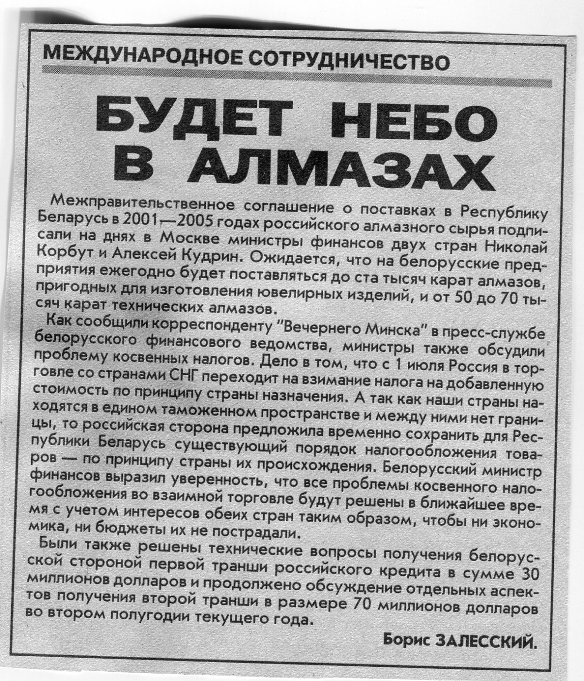 Залесский, Б. Будет небо в алмазах / Б. Залесский // Вечерний Минск. - 2001. - 30 мая.