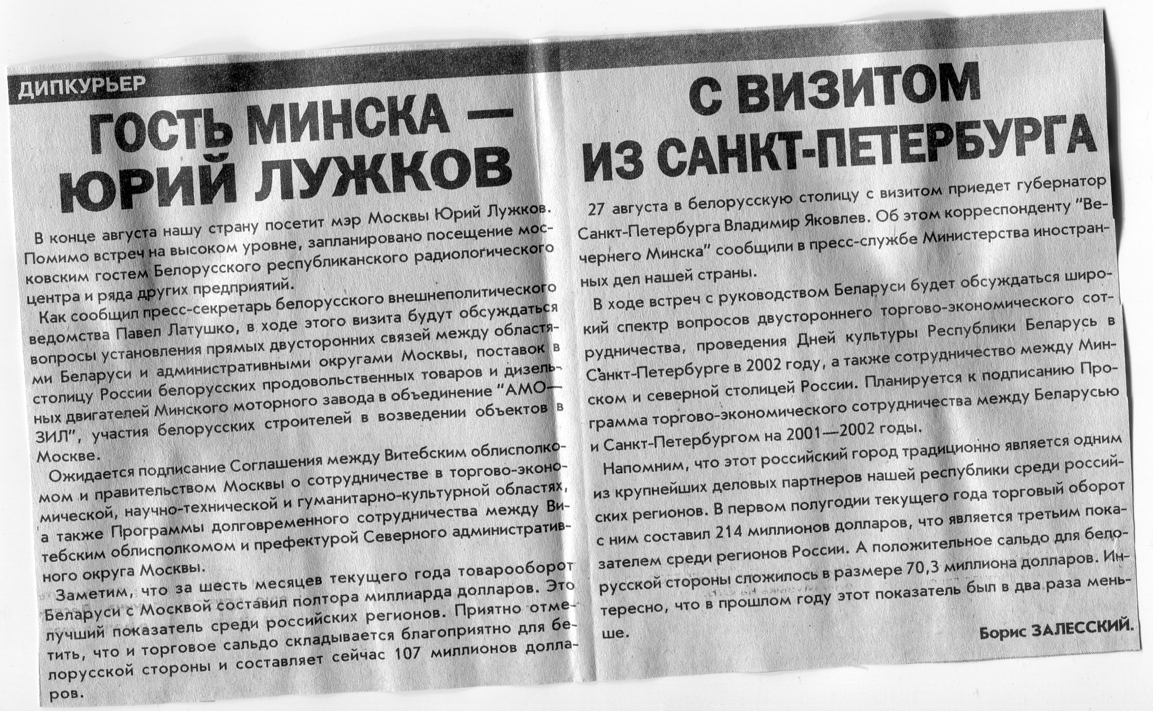Залесский, Б. Дипкурьер / Б. Залесский // Вечерний Минск. - 2001. - 24 авг.
