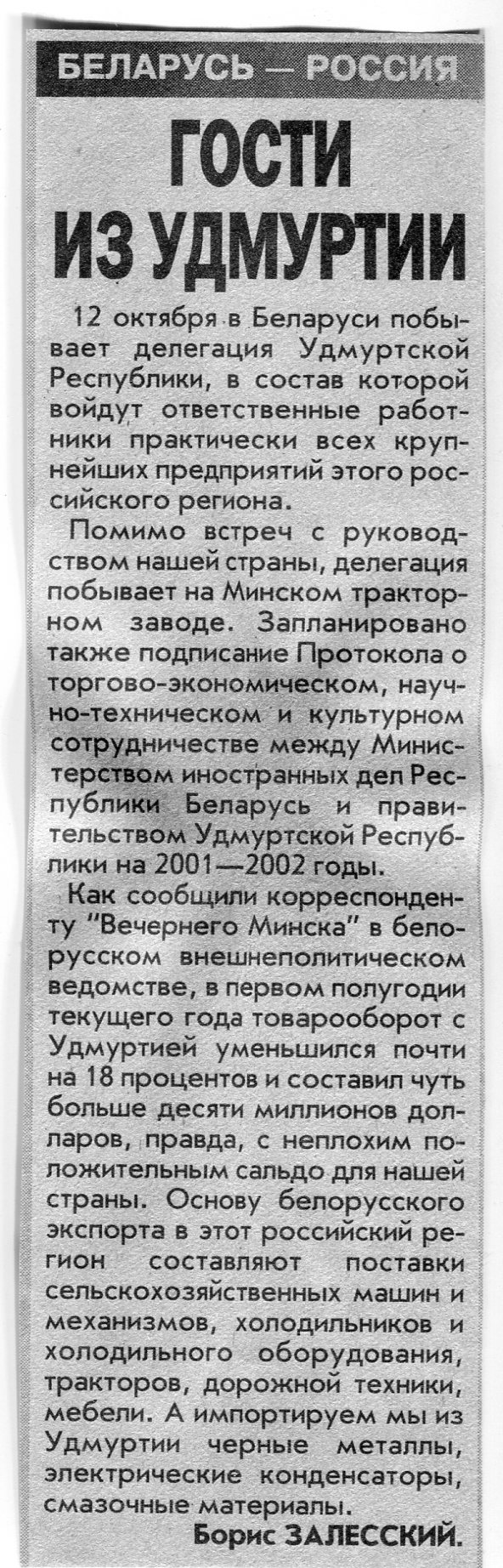 Залесский, Б. Гости из Удмуртии / Б. Залесский // Вечерний Минск. - 2001. - 10 окт.