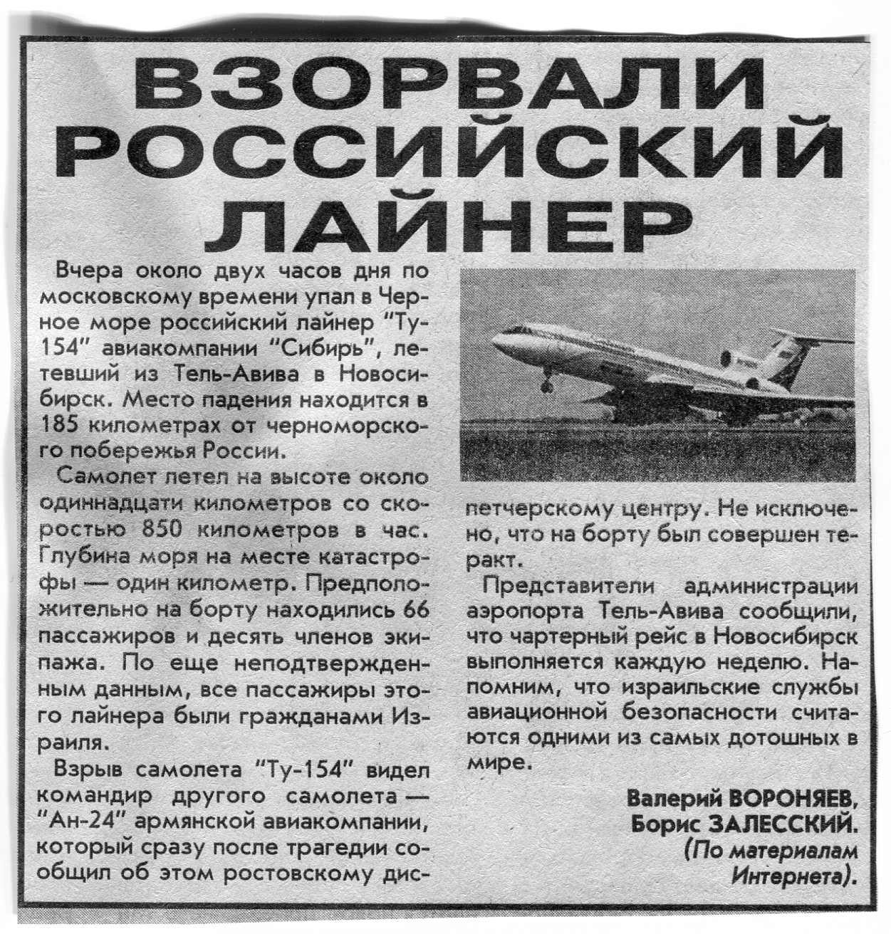 Залесский, Б. Взорвали российский лайнер / Б. Залесский, В. Вороняев // Вечерний Минск. - 2001. - 5 окт.