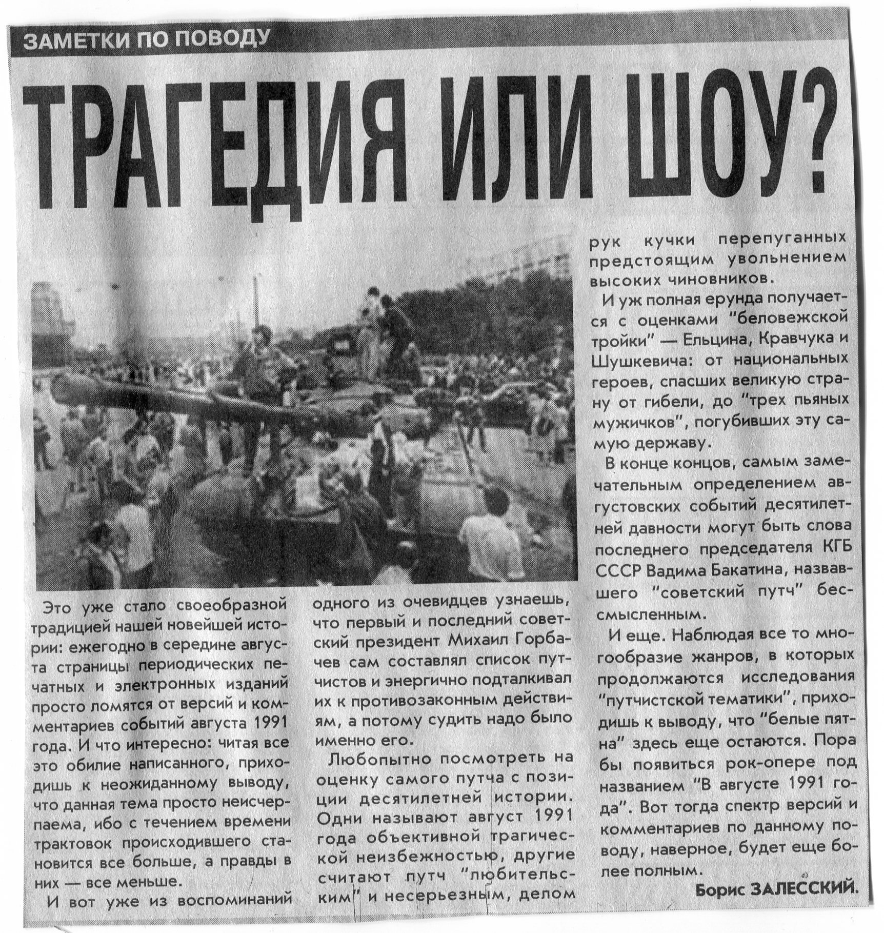 Залесский, Б. Трагедия или шоу? / Б. Залесский // Вечерний Минск. - 2001. - 20 авг.