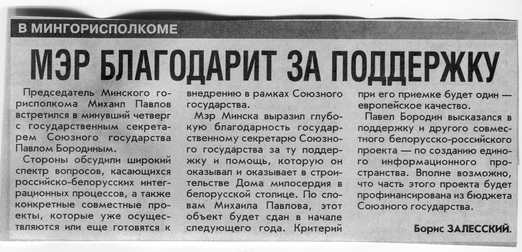 Залесский, Б. Мэр благодарит за поддержку / Б. Залесский // Вечерний Минск. - 2001. - 5 нояб.