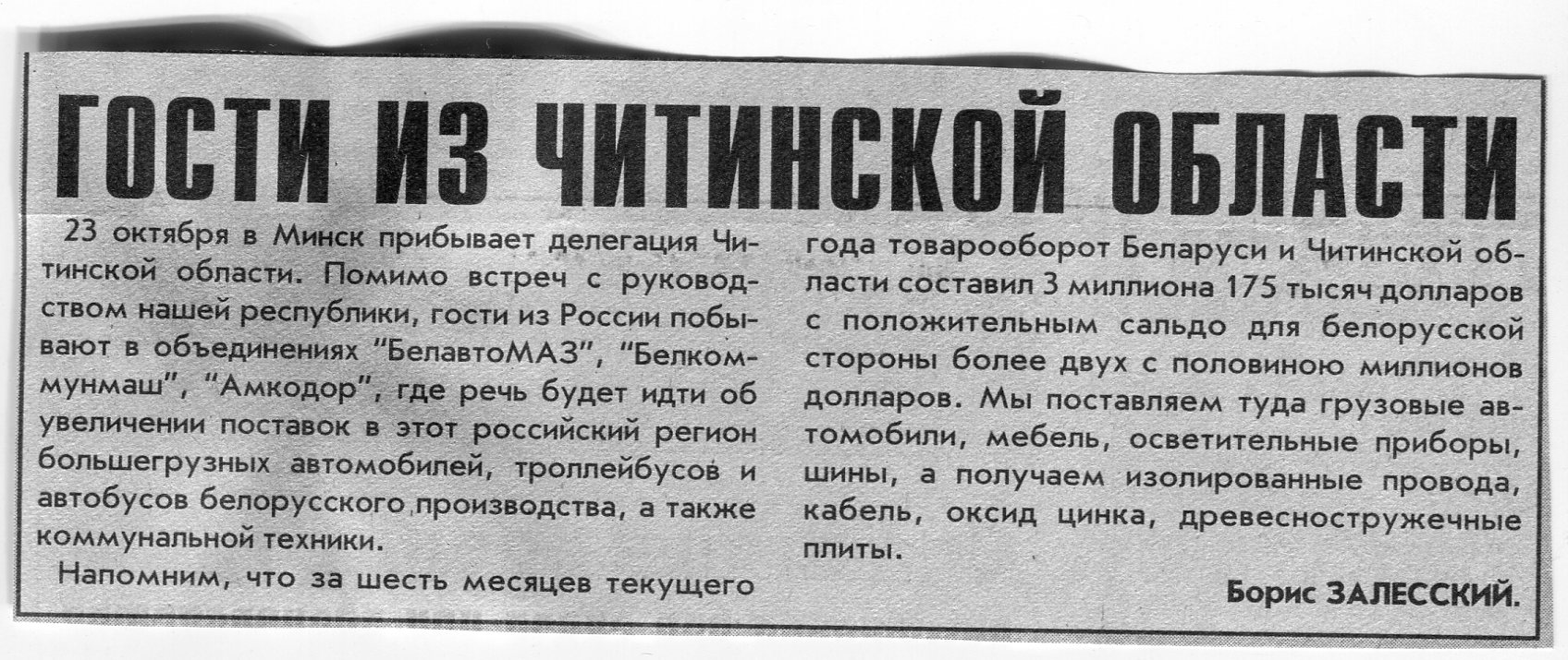 Залесский, Б. Гости из Читинской области / Б. Залесский // Вечерний Минск. - 2001. - 22 окт.