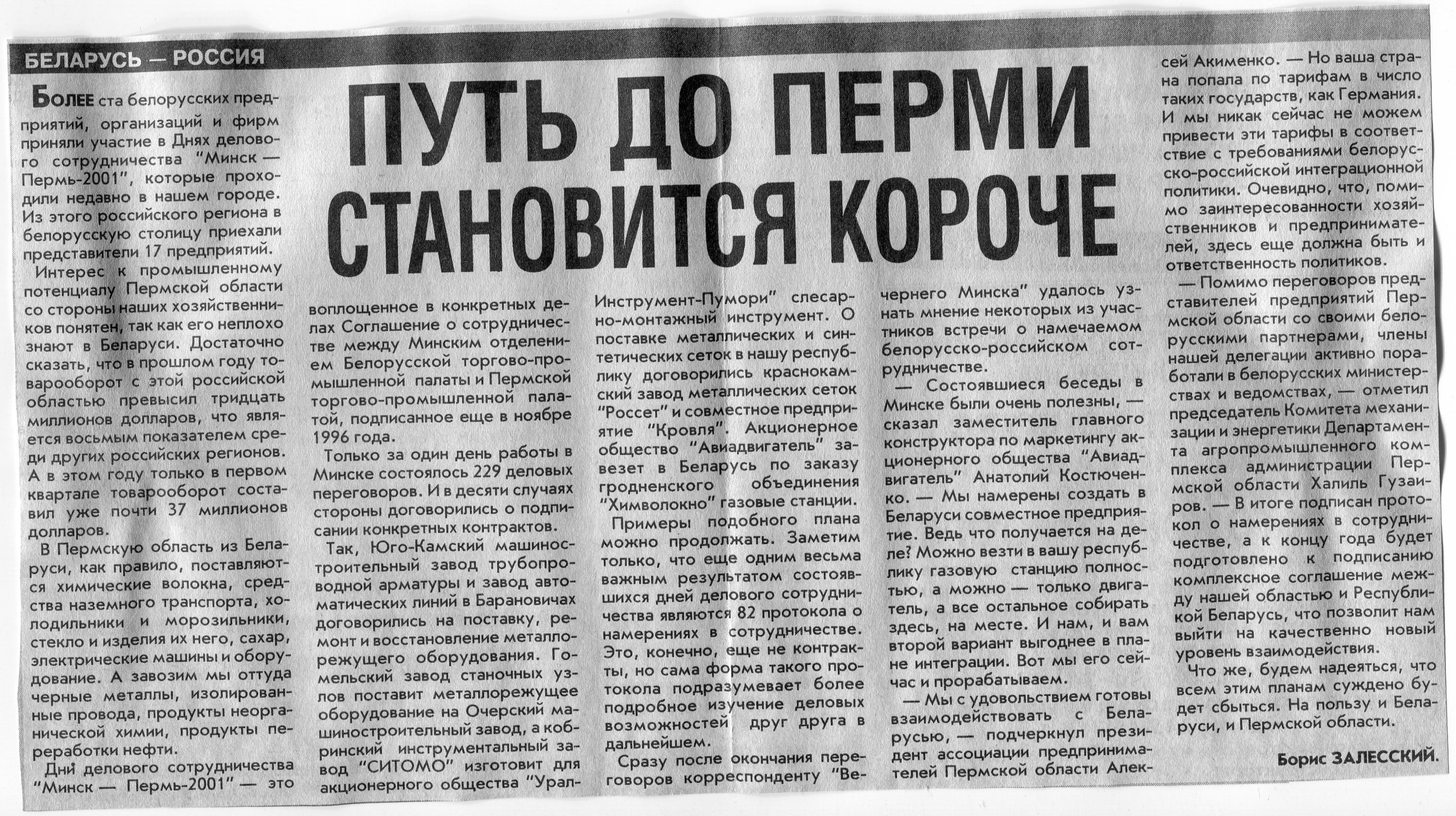 Залесский, Б. Путь до Перми становится короче / Б. Залесский // Вечерний Минск. - 2001. - 20 авг.