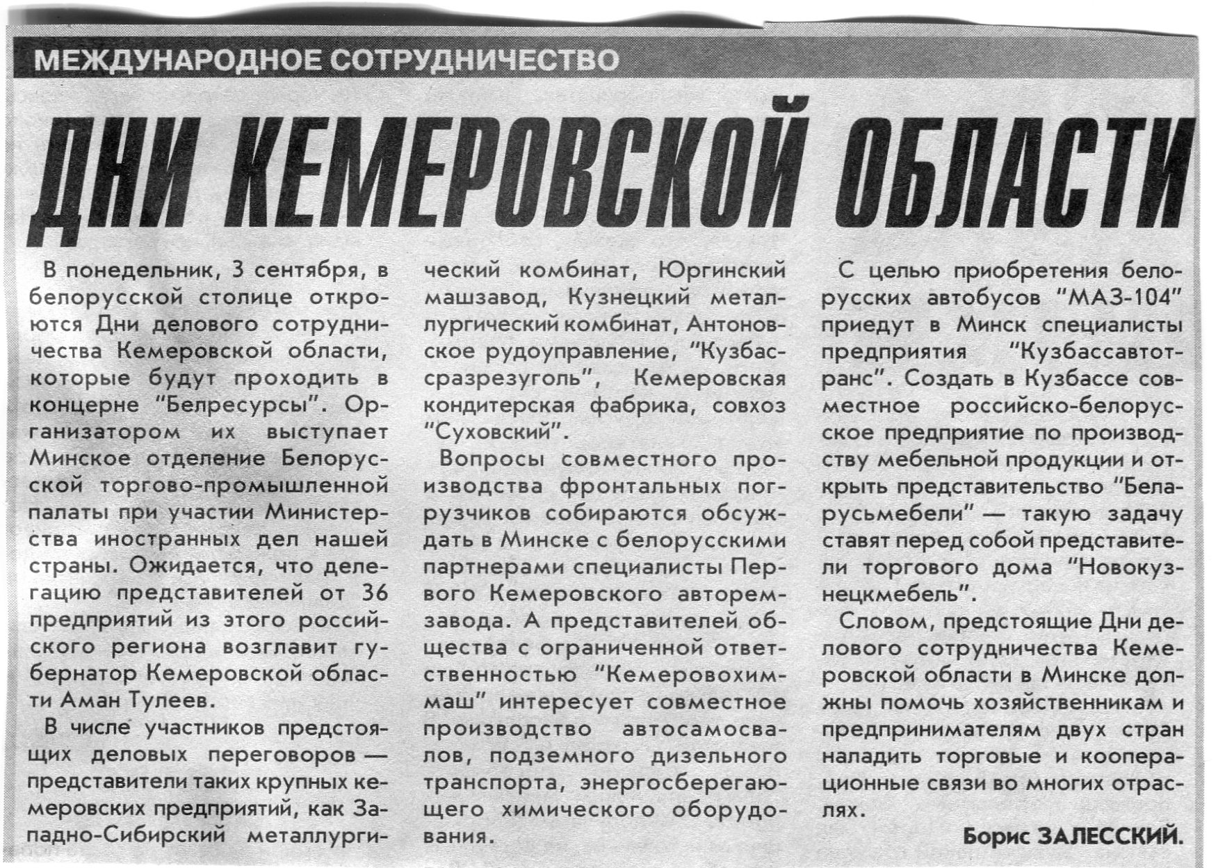 Залесский, Б. Дни Кемеровской области / Б. Залесский // Вечерний Минск. - 2001. - 31 авг.