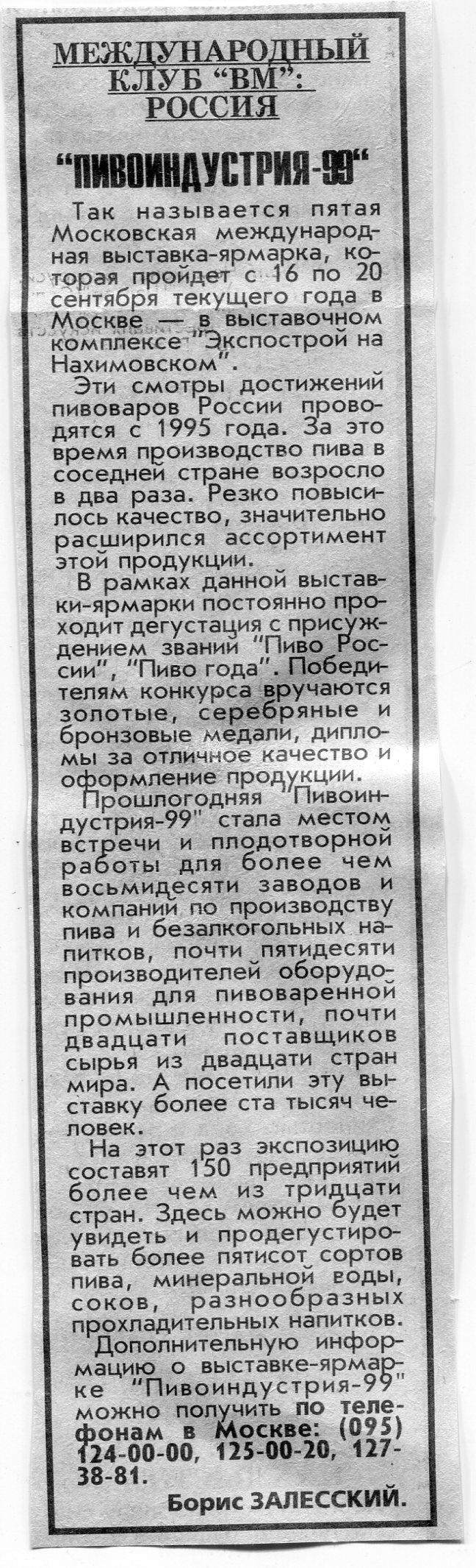 Залесский, Б. "Пивоиндустрия-99" / Б. Залесский // Вечерний Минск. - 1999. - 16 июл.