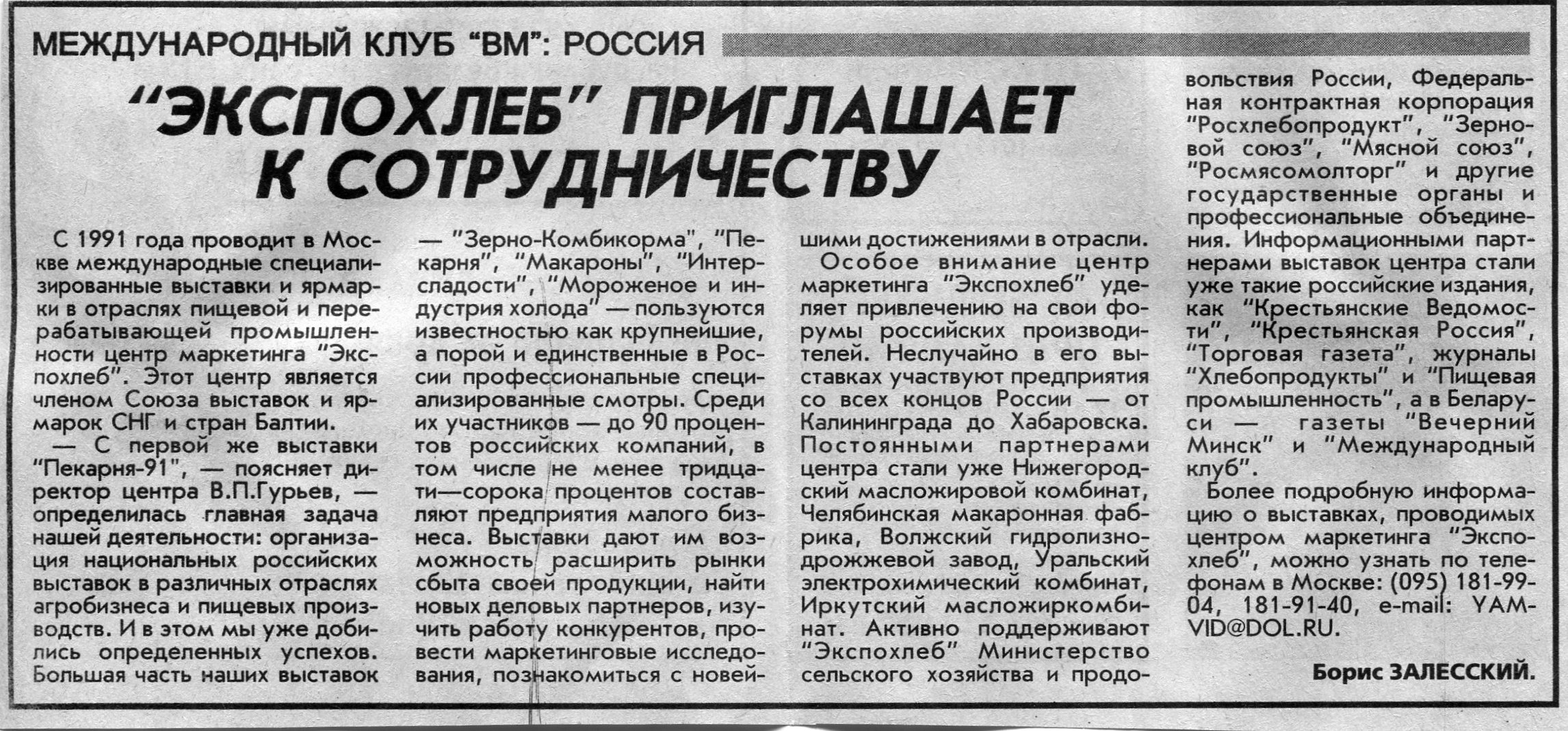 Залесский, Б. "Экспохлеб" приглашает к сотрудничеству / Б. Залесский // Вечерний Минск. - 1999. - 2 июн.