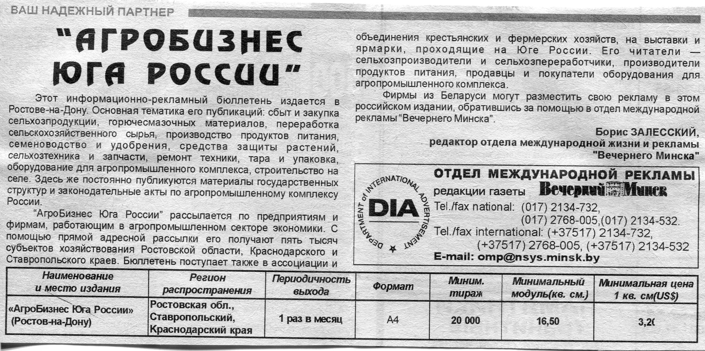 Залесский, Б. "Агробизнес Юга России" / Б. Залесский // Рекламное приложение к Вечернему Минску. – 1999. – 1 июн.