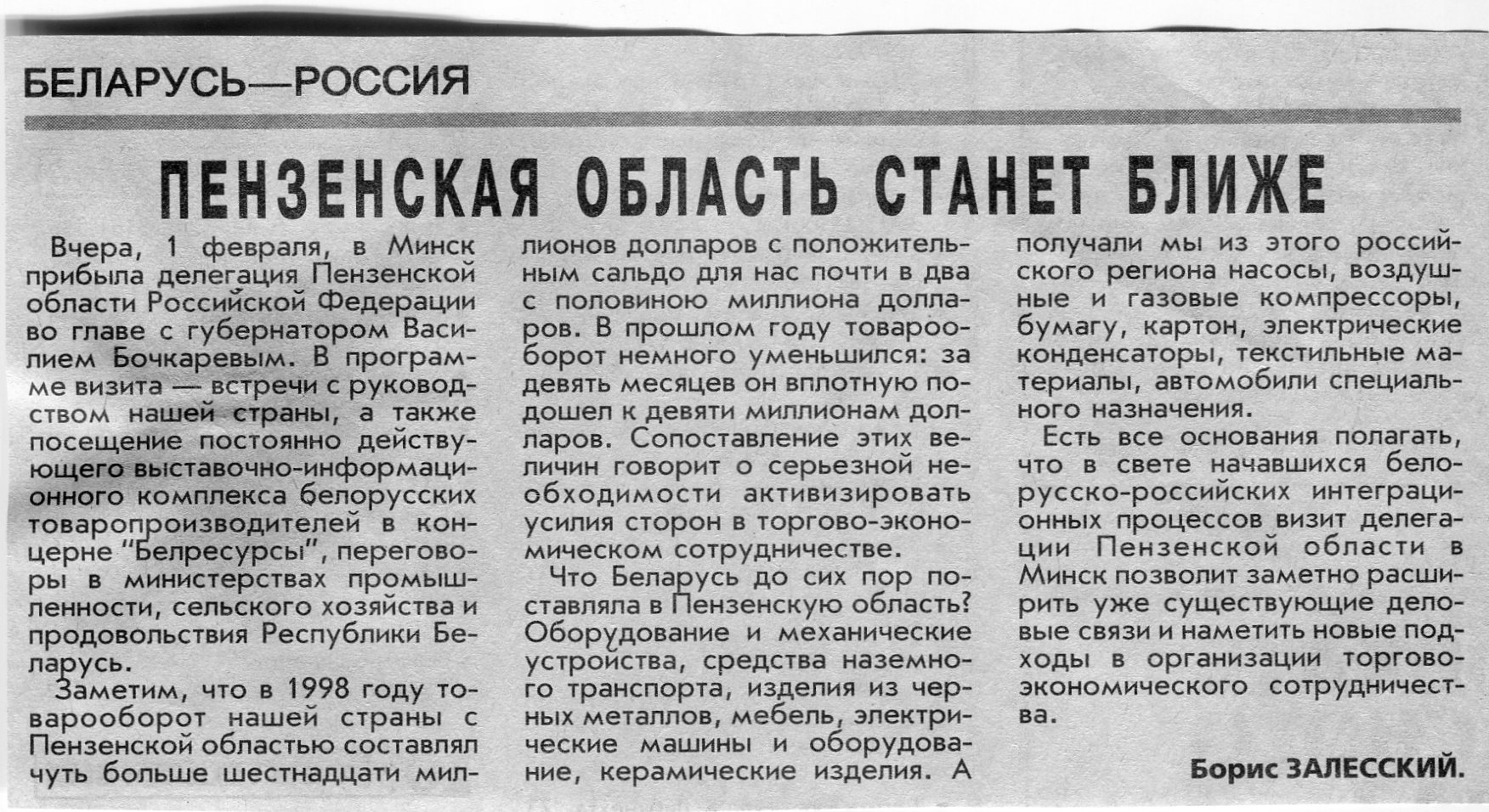 Залесский, Б. Пензенская область станет ближе / Б. Залесский // Вечерний Минск. - 2000. - 2 февр.