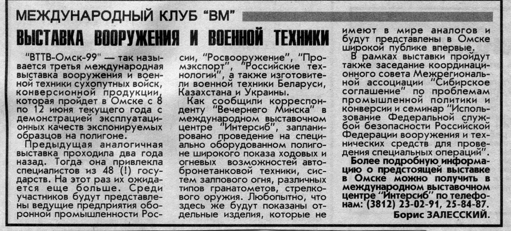 Залесский, Б. Выставка вооружения и военной техники / Б. Залесский // Вечерний Минск. - 1999. - 2 июн.