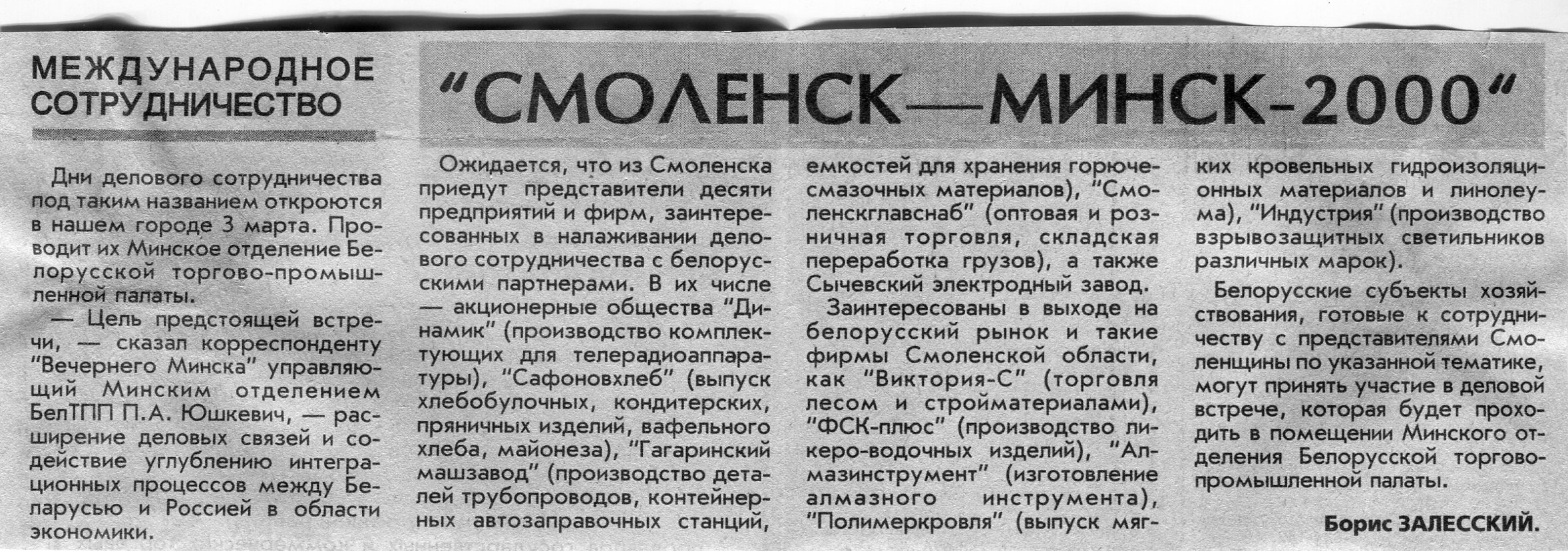 Залесский, Б. "Смоленск - Минск - 2000" / Б. Залесский // Вечерний Минск. - 2000.- 1 мар.