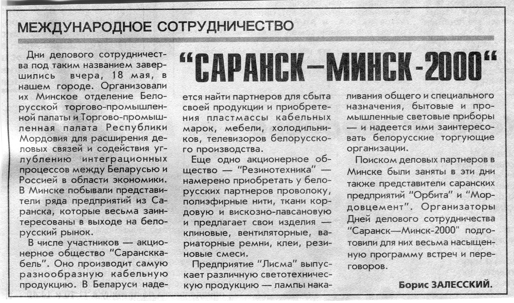 Залесский, Б. "Саранск - Минск - 2000" / Б. Залесский // Вечерний Минск. - 2000. - 19 мая.