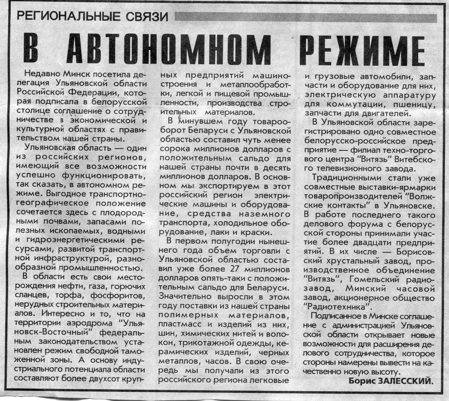 Залесский, Б. В автономном режиме / Б. Залесский // Вечерний Минск. - 1998. - 28 дек.