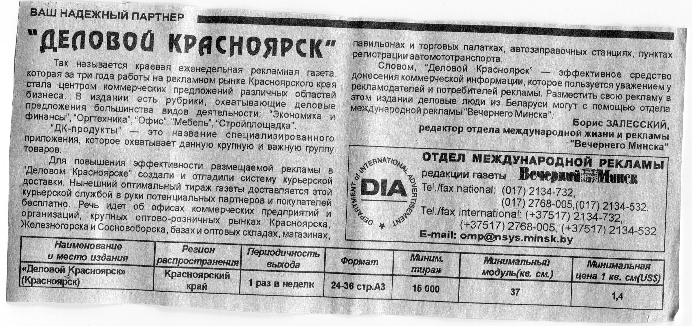 Залесский, Б. "Деловой Красноярск" / Б. Залесский // Вечерний Минск. – 1998. – 2 окт.