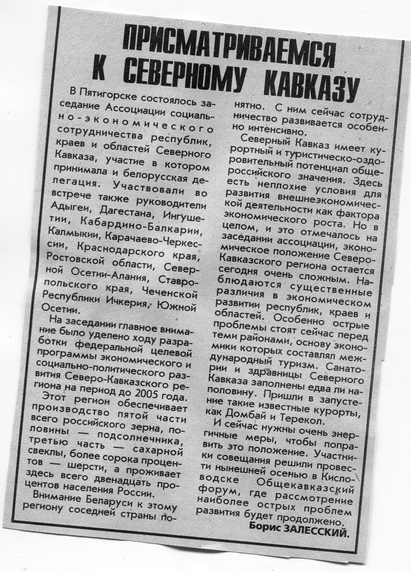 Залесский, Б. Присматриваемся к Северному Кавказу / Б. Залесский // Вечерний Минск. - 1998. - 16 сент.