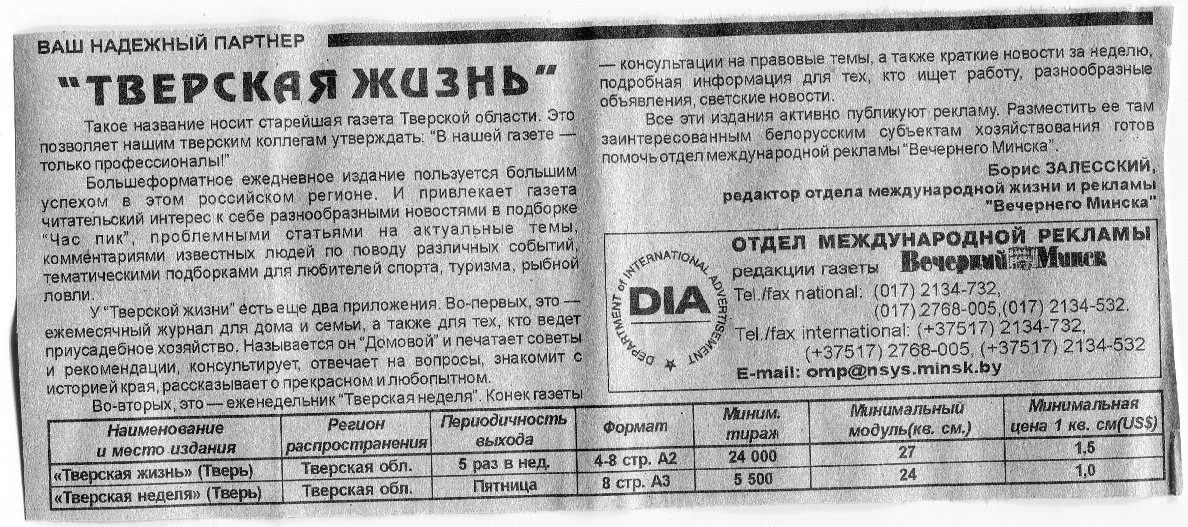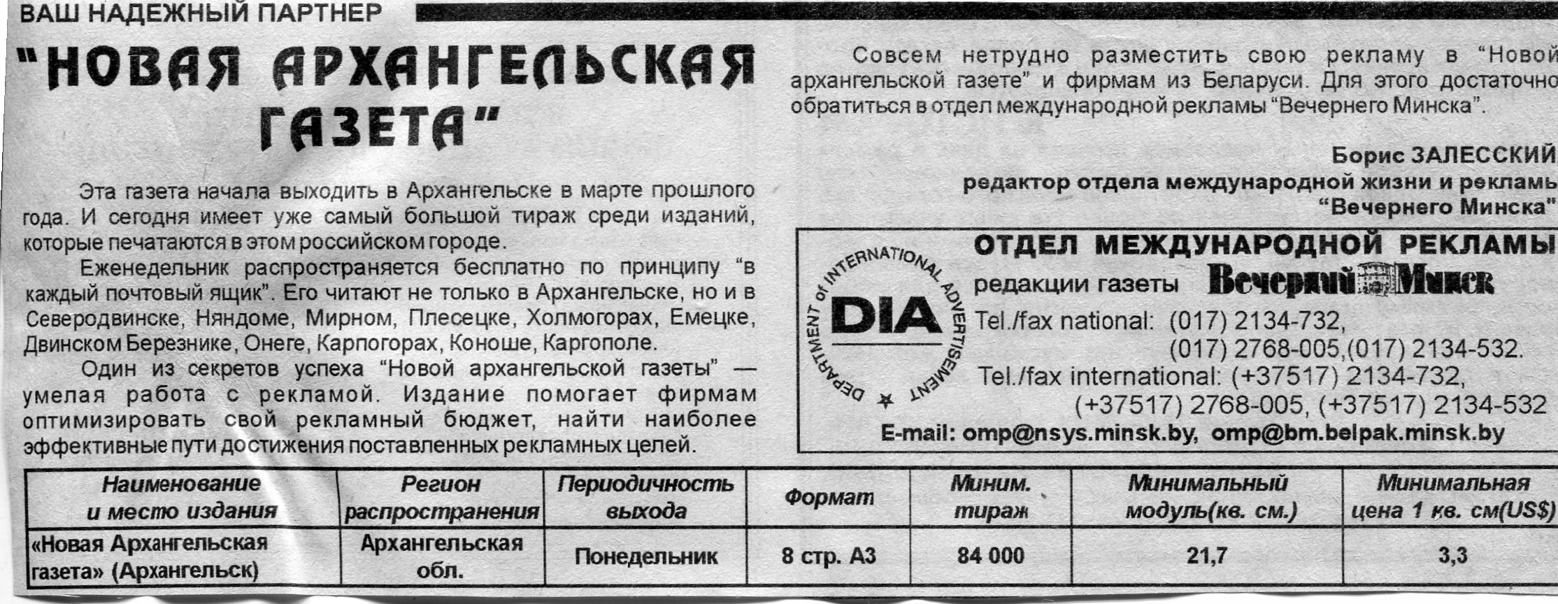 Залесский, Б. "Новая архангельская газета" / Б. Залесский // Вечерний Минск. – 1998. – 15 сент.