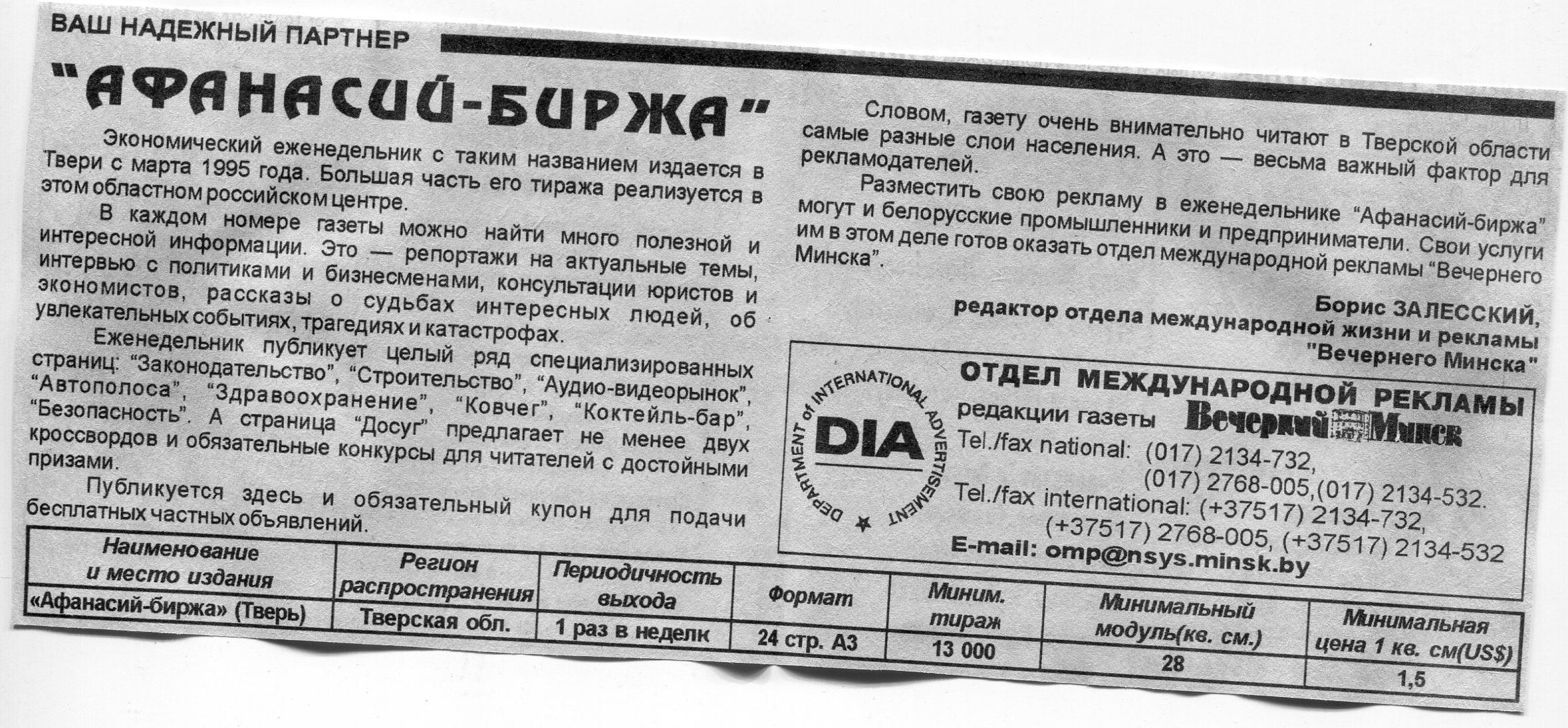 Залесский, Б. "Афанасий-биржа" / Б. Залесский // Вечерний Минск. – 1998. – 30 сент.