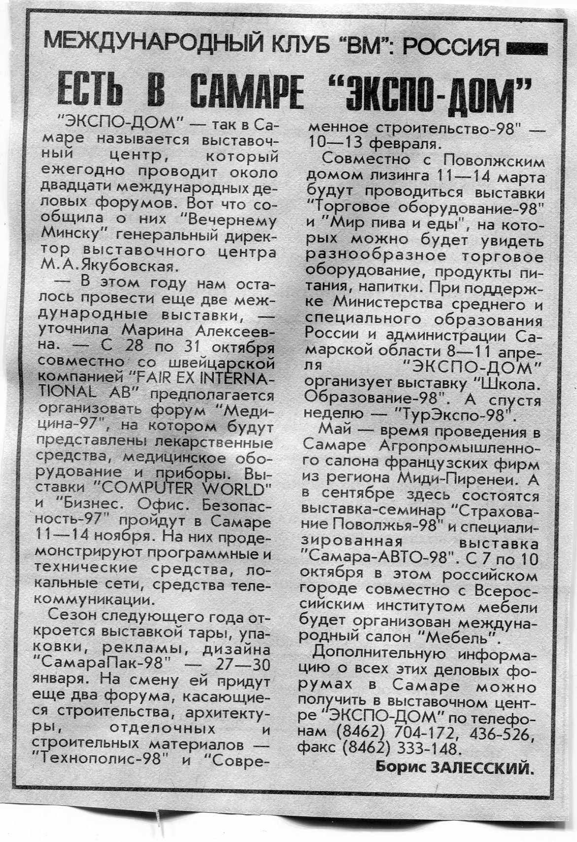 Залесский, Б. Есть в Самаре "Экспо-Дом" / Б. Залесский // Вечерний Минск. - 1997. - 23 сент.