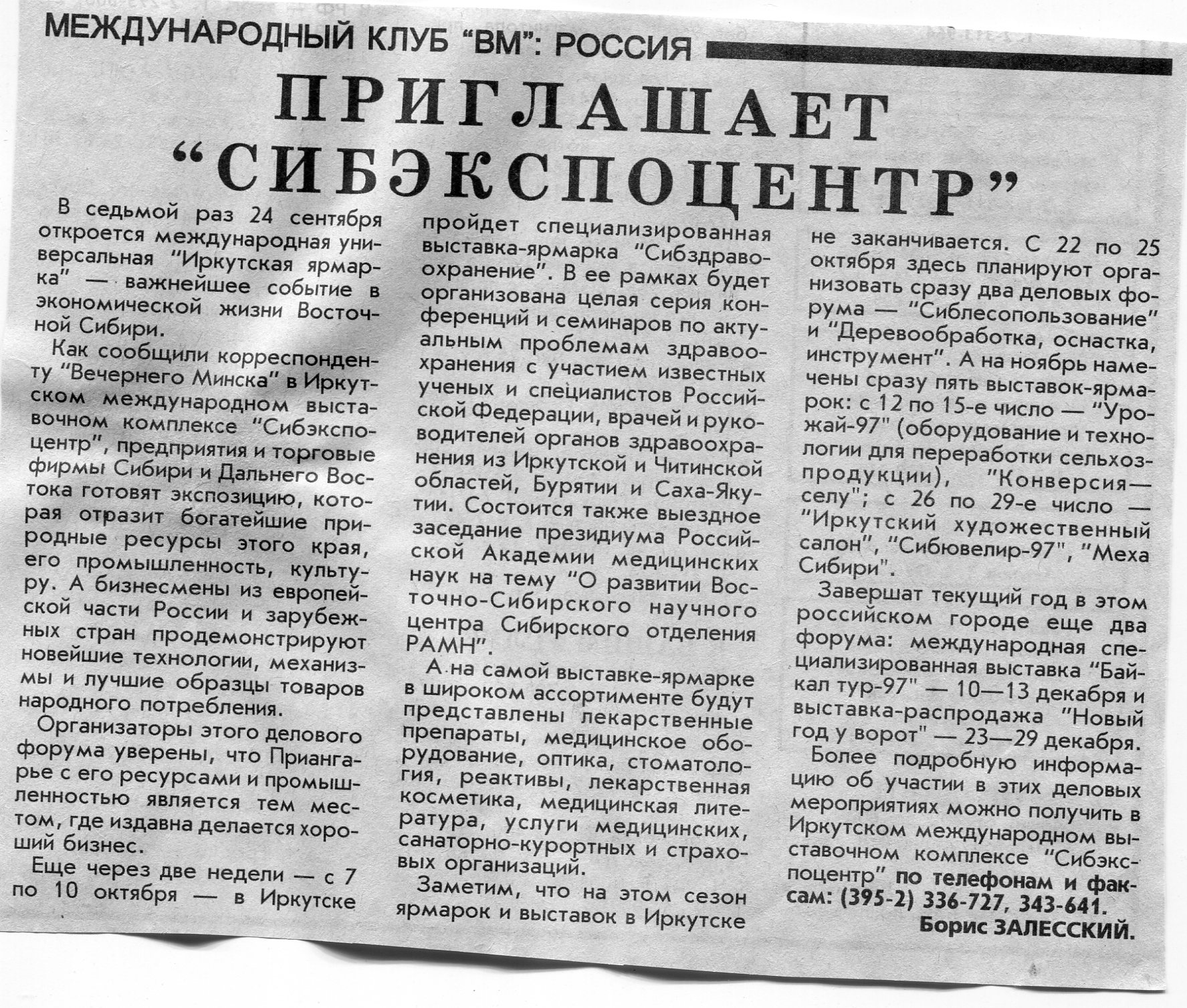 Залесский, Б. Приглашает "Сибэкспоцентр" / Б. Залесский // Вечерний Минск. - 1997. - 23 сент.