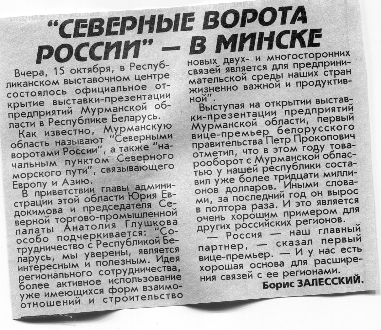 Залесский, Б. "Северные ворота России" - в Минске / Б. Залесский // Вечерний Минск. - 1997. - 16 окт.