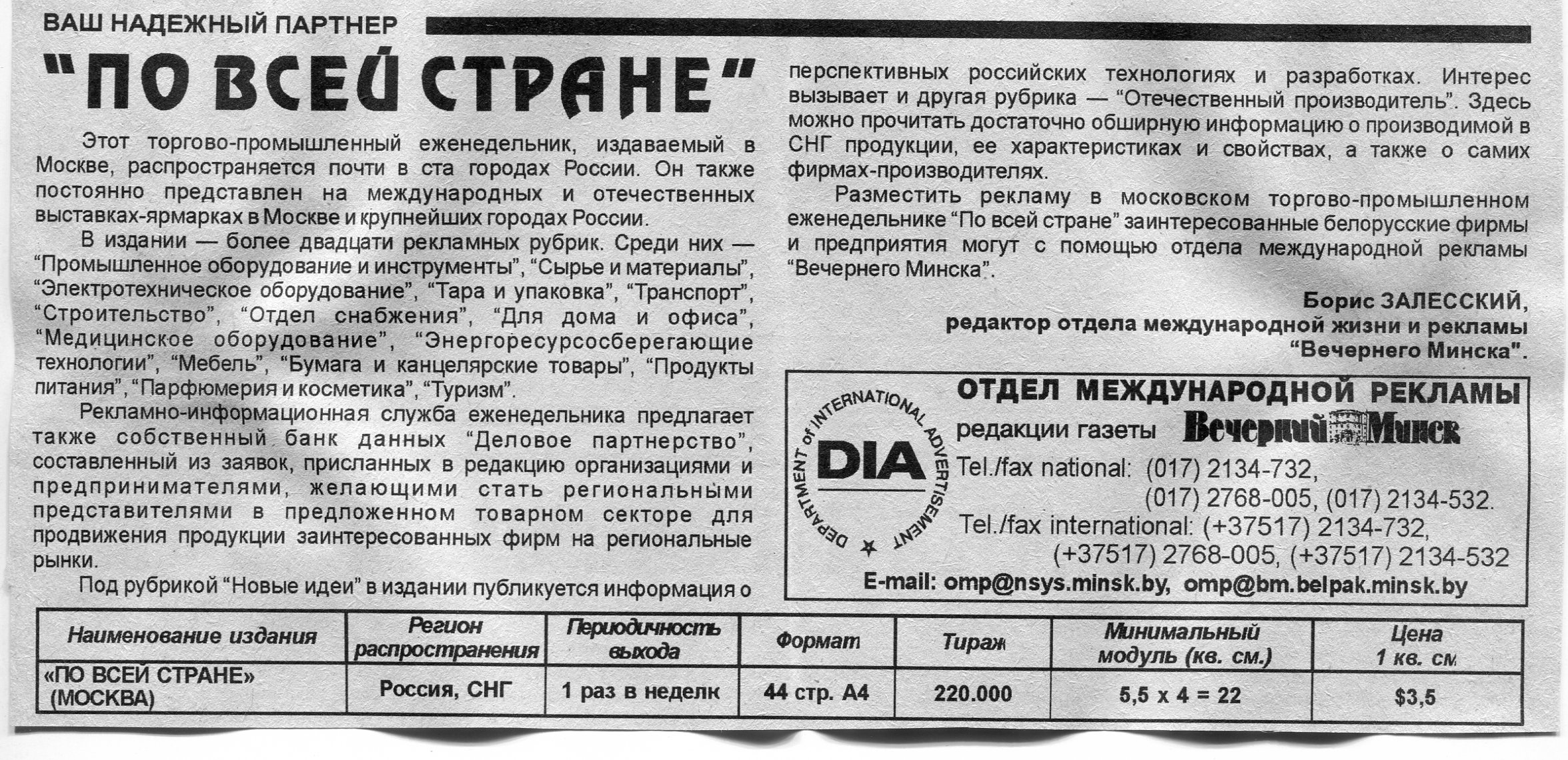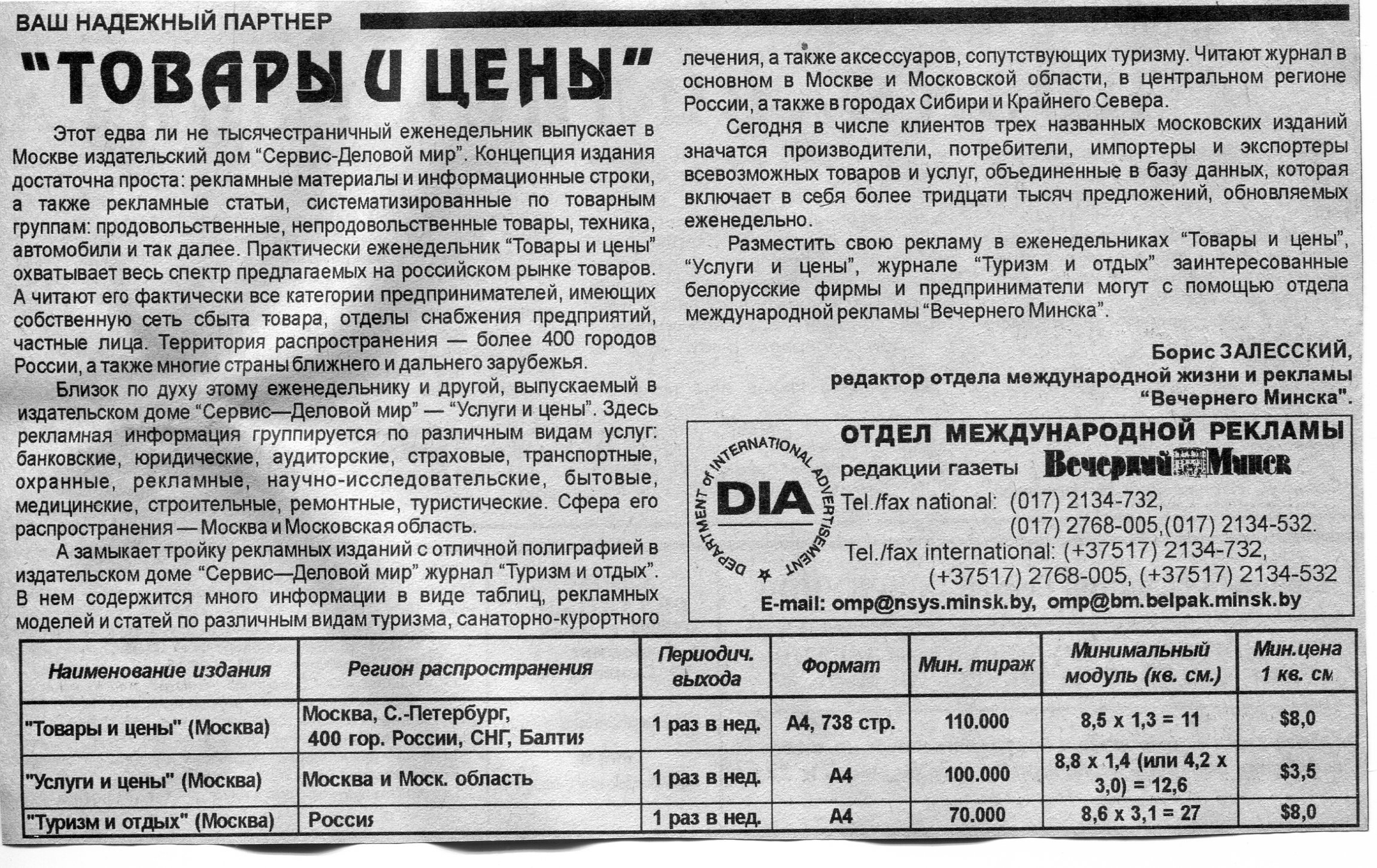 Залесский, Б. "Мир рекламы" / Б. Залесский // Вечерний Минск. - 1997. - 16 дек.