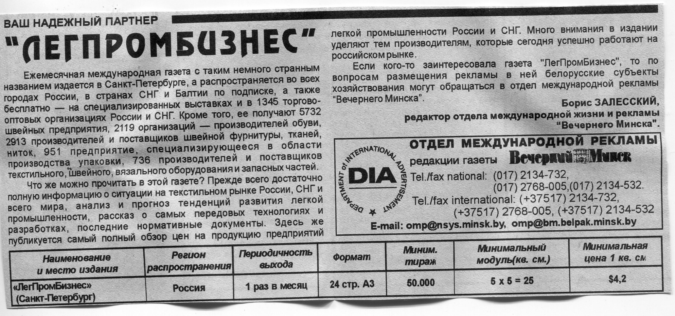 Залесский, Б. "Легпромбизнес" / Б. Залесский // Вечерний Минск. – 1997. – 22 дек.