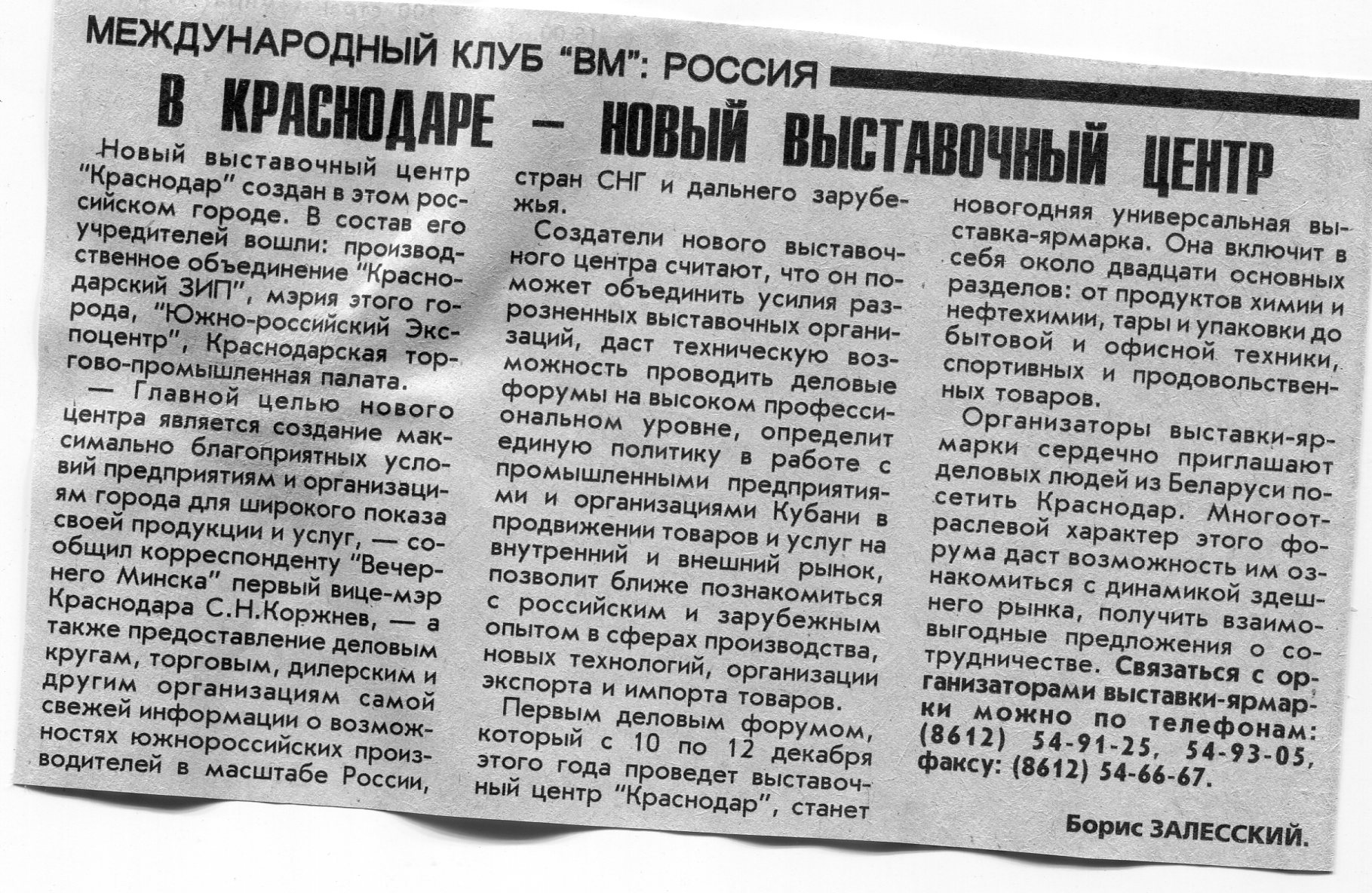 Залесский, Б. В Краснодаре - новый выставочный центр / Б. Залесский // Вечерний Минск. - 1997. - 9 дек.