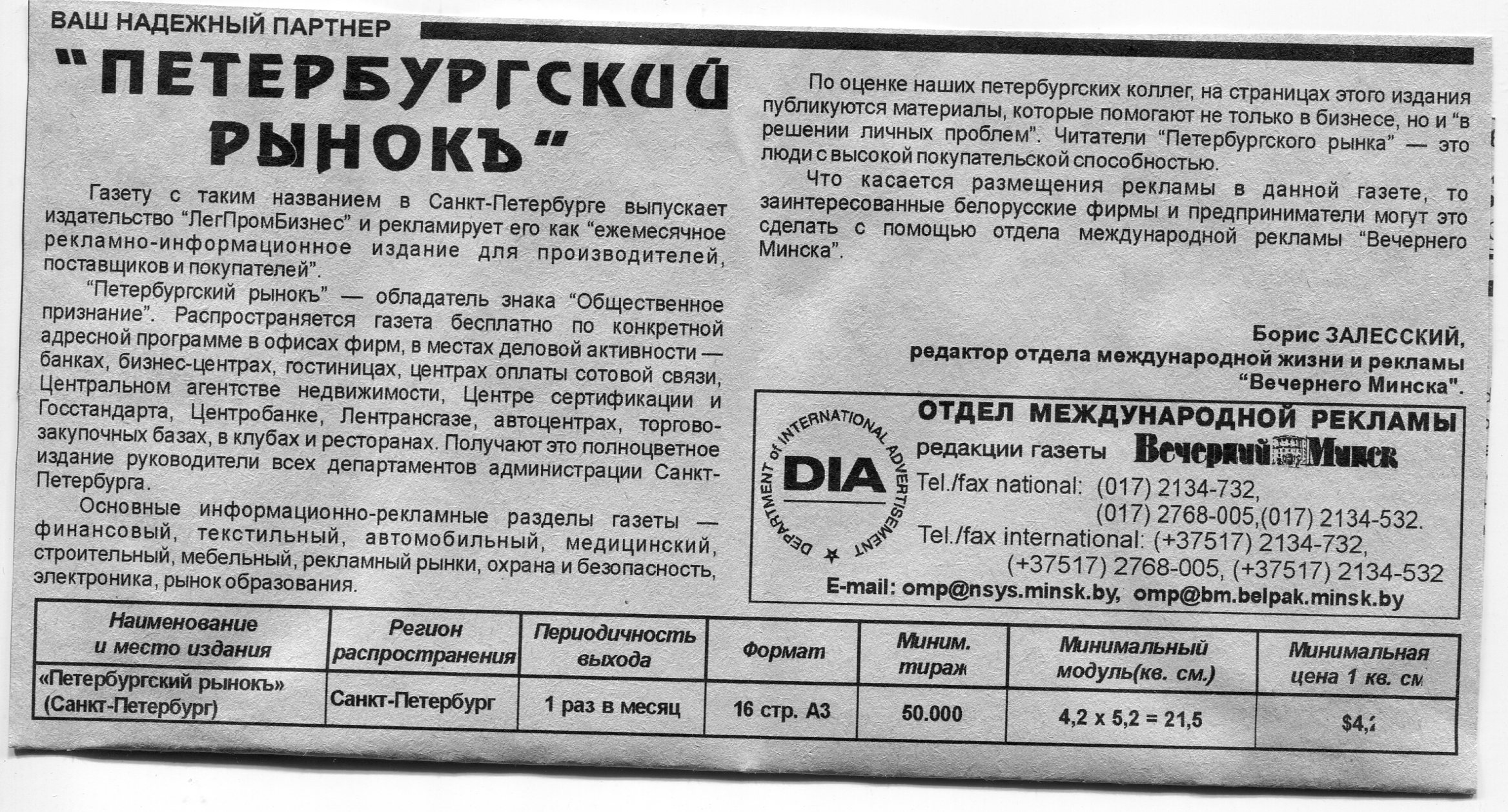 Залесский, Б. "Петербургский рынокъ" / Б. Залесский // Вечерний Минск. – 1997. – 18 дек.