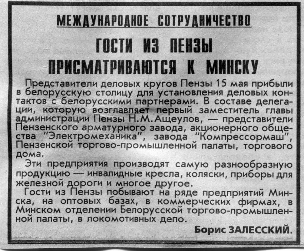 Залесский, Б. Гости из Пензы присматриваются к Минску / Б. Залесский // Вечерний Минск. - 1997. - 16 мая.