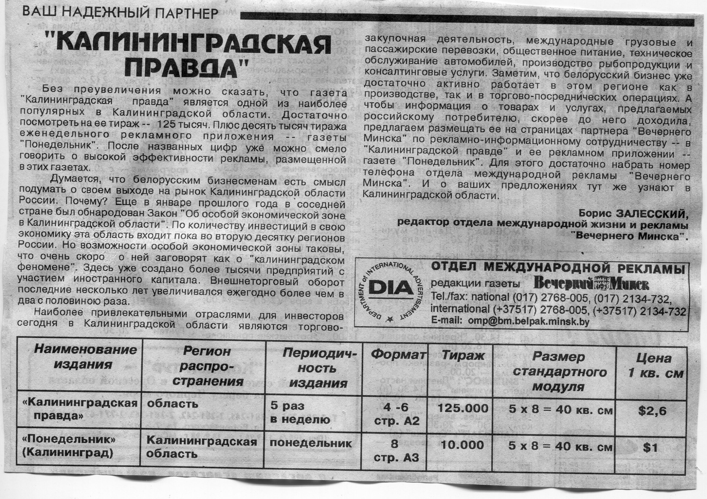 Залесский, Б. "Калининградская правда" / Б. Залесский // Вечерний Минск. - 1997. - 12 июн.