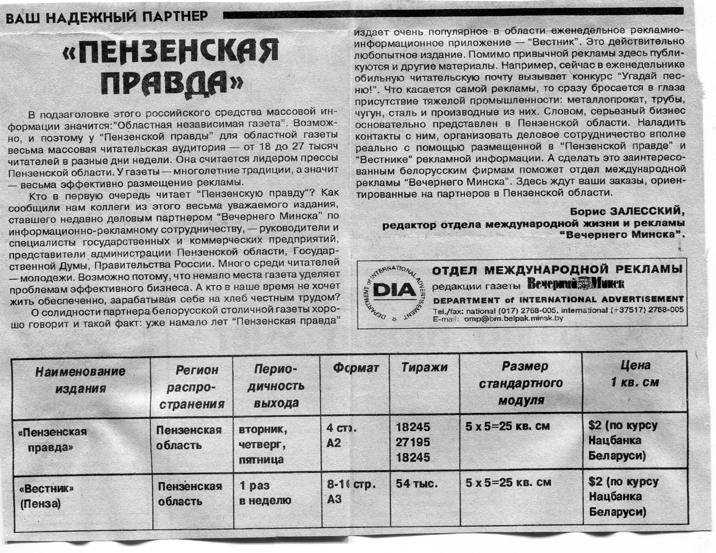 Залесский, Б. "Пензенская правда" / Б. Залесский // Вечерний Минск. - 1997. - 16 апр.