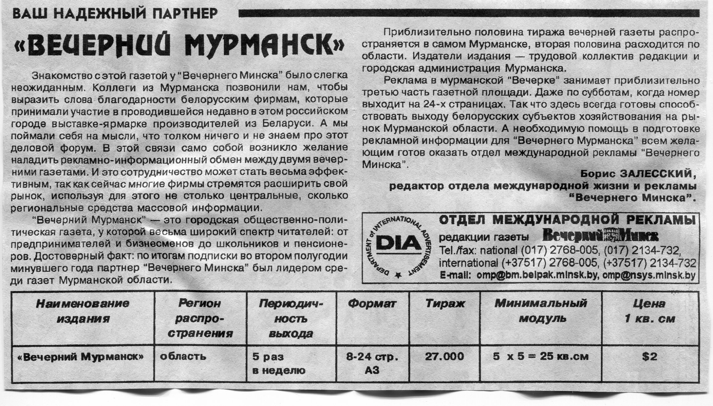 Залесский, Б. "Вечерний Мурманск" / Б. Залесский // Вечерний Минск. - 1997. - 30 июн.