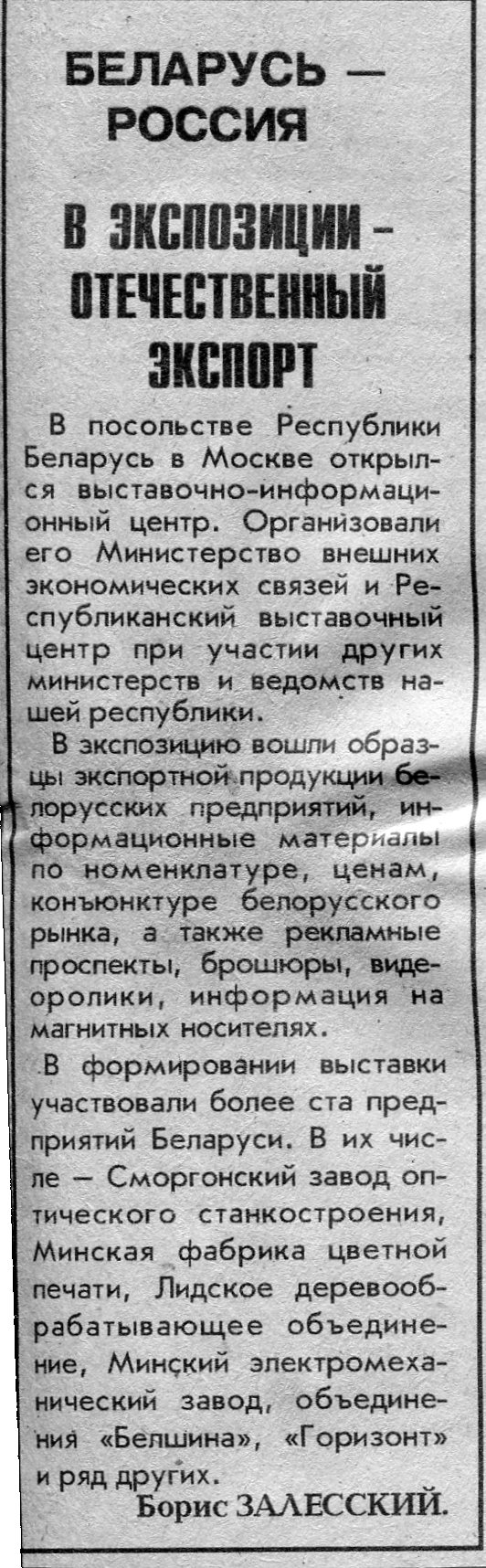 Залесский, Б. В экспозиции - отечественный экспорт / Б. Залесский // Вечерний Минск. - 1995. - 20 сент.