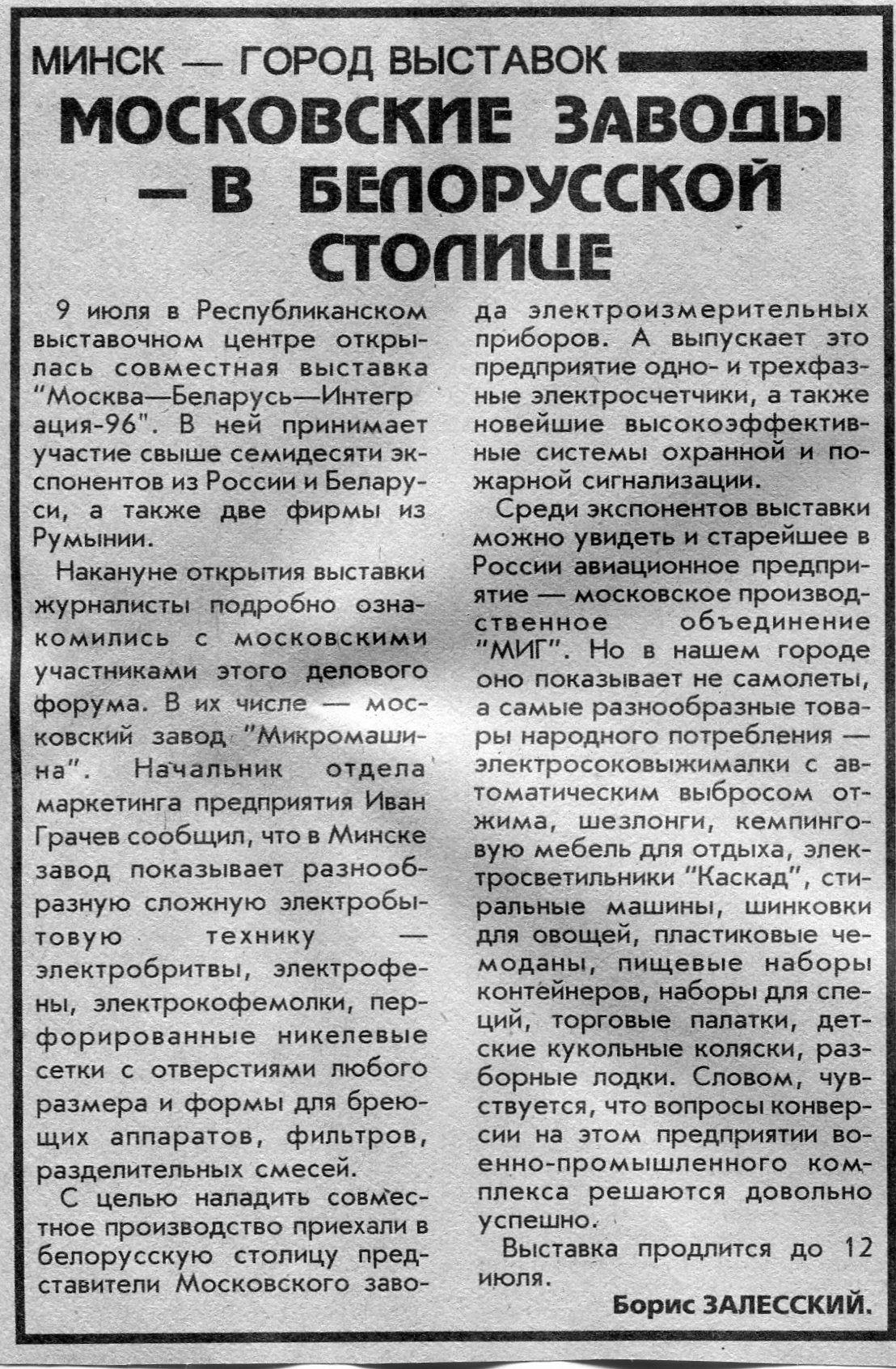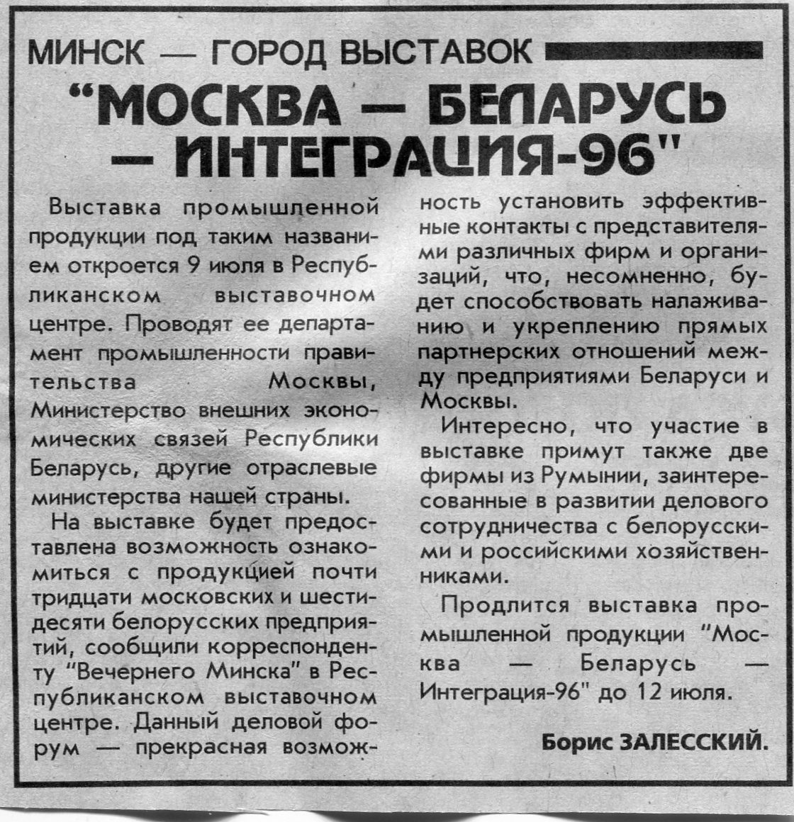 Залесский, Б. "Москва - Беларусь - Интеграция-96" / Б. Залесский // Вечерний Минск. - 1996. - 4 июл.